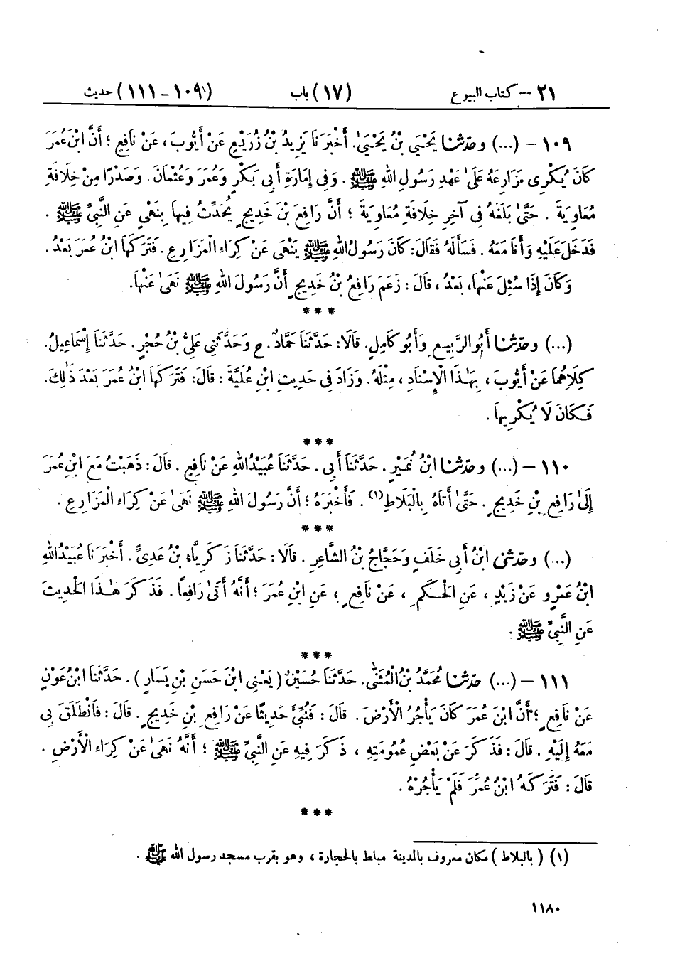 110 - (1547) وحَدَّثَنَا ابْنُ نُمَيْرٍ، حَدَّثَنَا أَبِي، حَدَّثَنَا عُبَيْدُ اللهِ، عَنْ نَافِعٍ، قَالَ: ذَهَبْتُ مَعَ ابْنِ عُمَرَ إِلَى رَافِعِ بْنِ خَدِيجٍ حَتَّى أَتَاهُ بِالْبَلَاطِ، فَأَخْبَرَهُ، «أَنَّ رَسُولَ اللهِ صَلَّى اللهُ عَلَيْهِ وَسَلَّمَ §نَهَى عَنْ كِرَاءِ الْمَزَارِعِ»،