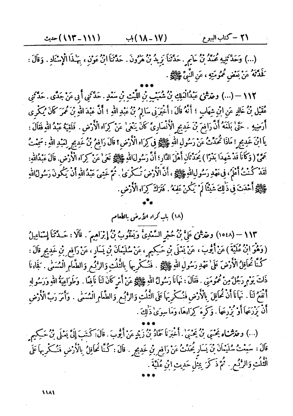 113 - (1548) وحَدَّثَنِي عَلِيُّ بْنُ حُجْرٍ السَّعْدِيُّ، وَيَعْقُوبُ بْنُ إِبْرَاهِيمَ، قَالَا: حَدَّثَنَا إِسْمَاعِيلُ وَهُوَ ابْنُ عُلَيَّةَ، عَنْ أَيُّوبَ، عَنْ يَعْلَى بْنِ حَكِيمٍ، عَنْ سُلَيْمَانَ بْنِ يَسَارٍ، عَنْ رَافِعِ بْنِ خَدِيجٍ، قَالَ: كُنَّا نُحَاقِلُ الْأَرْضَ عَلَى عَهْدِ رَسُولِ اللهِ صَلَّى اللهُ عَلَيْهِ وَسَلَّمَ، فَنُكْرِيهَا بِالثُّلُثِ وَالرُّبُعِ، وَالطَّعَامِ الْمُسَمَّى، فَجَاءَنَا ذَاتَ يَوْمٍ رَجُلٌ مَنْ عُمُومَتِي، فَقَالَ: نَهَانَا رَسُولُ اللهِ صَلَّى اللهُ عَلَيْهِ وَسَلَّمَ عَنْ أَمْرٍ كَانَ لَنَا نَافِعًا، وَطَوَاعِيَةُ اللهِ وَرَسُولِهِ أَنْفَعُ لَنَا، «§نَهَانَا أَنْ نُحَاقِلَ بِالْأَرْضِ فَنُكْرِيَهَا عَلَى الثُّلُثِ وَالرُّبُعِ، وَالطَّعَامِ الْمُسَمَّى، وَأَمَرَ رَبَّ الْأَرْضِ أَنْ يَزْرَعَهَا، أَوْ يُزْرِعَهَا، وَكَرِهَ كِرَاءَهَا وَمَا سِوَى ذَلِكَ»،