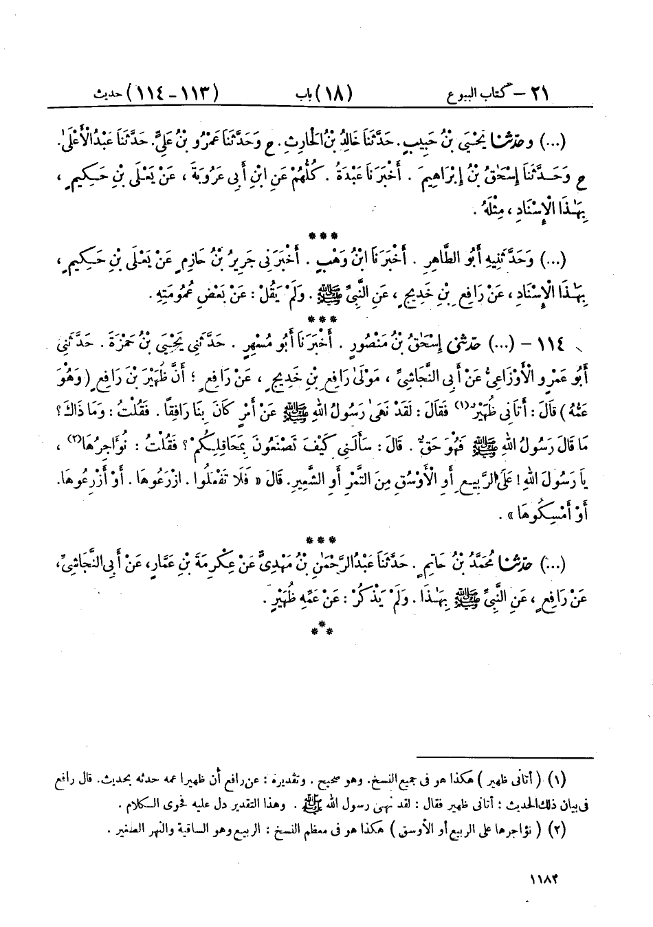 114 - (1548) حَدَّثَنِي إِسْحَاقُ بْنُ مَنْصُورٍ، أَخْبَرَنَا أَبُو مُسْهِرٍ، حَدَّثَنِي يَحْيَى بْنُ حَمْزَةَ، حَدَّثَنِي أَبُو عَمْرٍو الْأَوْزَاعِيُّ، عَنْ أَبِي النَّجَاشِيِّ، مَوْلَى رَافِعِ بْنِ خَدِيجٍ، عَنْ رَافِعٍ، أَنَّ ظُهَيْرَ بْنَ رَافِعٍ - وَهُوَ عَمُّهُ - قَالَ: أَتَانِي ظُهَيْرٌ، فَقَالَ: لَقَدْ نَهَى رَسُولُ اللهِ صَلَّى اللهُ عَلَيْهِ وَسَلَّمَ عَنْ أَمْرٍ كَانَ بِنَا رَافِقًا، فَقُلْتُ: وَمَا ذَاكَ؟ مَا قَالَ رَسُولُ اللهِ صَلَّى اللهُ عَلَيْهِ وَسَلَّمَ فَهُوَ حَقٌّ، قَالَ: سَأَلَنِي: «§كَيْفَ تَصْنَعُونَ بِمَحَاقِلِكُمْ؟» فَقُلْتُ: نُؤَاجِرُهَا يَا رَسُولَ اللهِ عَلَى الرَّبِيعِ، أَوِ الْأَوْسُقِ مِنَ التَّمْرِ أَوِ الشَّعِيرِ، قَالَ: «فَلَا تَفْعَلُوا، ازْرَعُوهَا، أَوْ أَزْرِعُوهَا، أَوْ أَمْسِكُوهَا»،