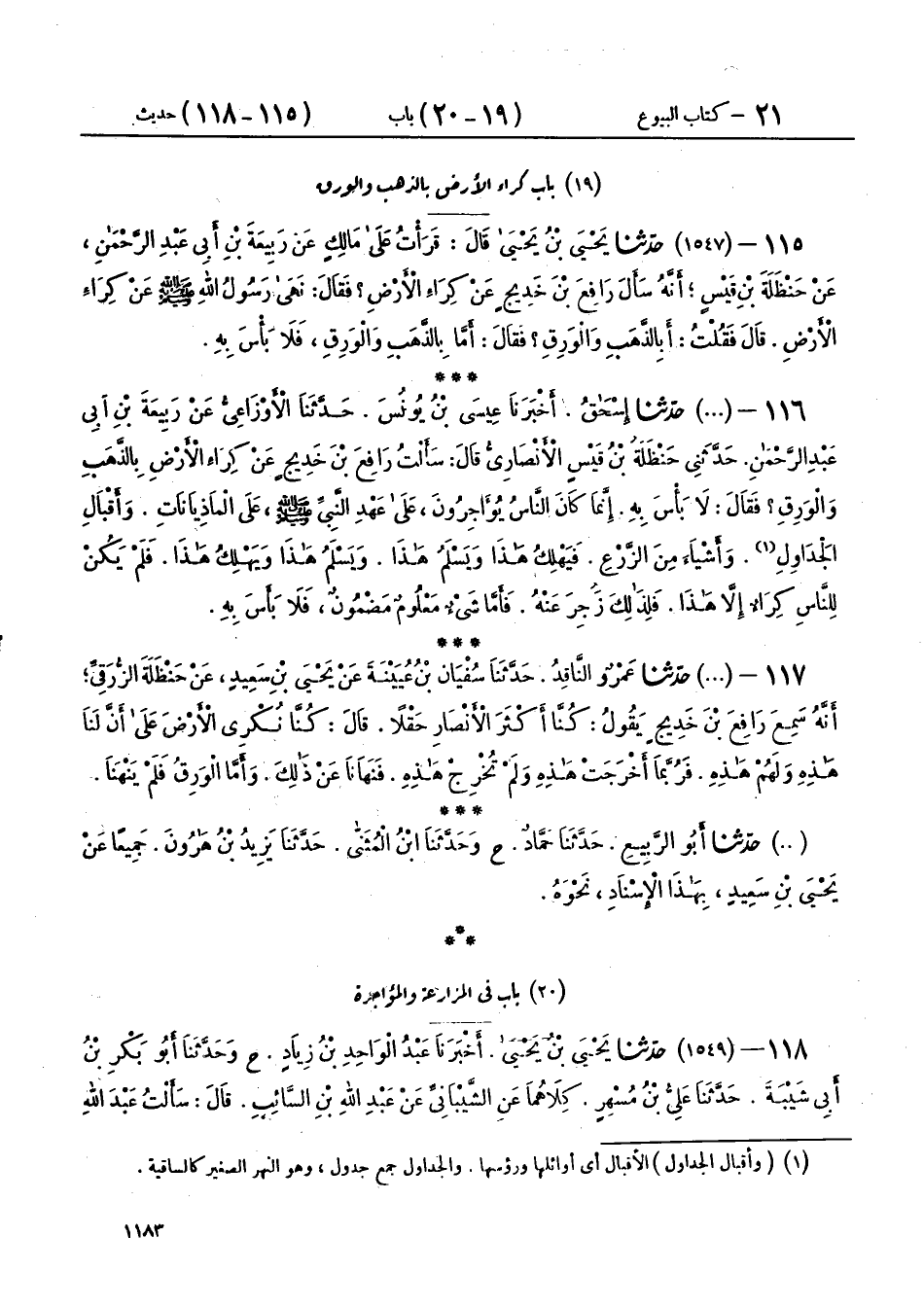 116 - (1547) حَدَّثَنَا إِسْحَاقُ، أَخْبَرَنَا عِيسَى بْنُ يُونُسَ، حَدَّثَنَا الْأَوْزَاعِيُّ، عَنْ رَبِيعَةَ بْنِ أَبِي عَبْدِ الرَّحْمَنِ، حَدَّثَنِي حَنْظَلَةُ بْنُ قَيْسٍ الْأَنْصَارِيُّ، قَالَ: سَأَلْتُ رَافِعَ بْنَ خَدِيجٍ §عَنْ كِرَاءِ الْأَرْضِ بِالذَّهَبِ وَالْوَرِقِ، فَقَالَ: «لَا بَأْسَ بِهِ، إِنَّمَا كَانَ النَّاسُ يُؤَاجِرُونَ عَلَى عَهْدِ النَّبِيِّ صَلَّى اللهُ عَلَيْهِ وَسَلَّمَ عَلَى الْمَاذِيَانَاتِ، وَأَقْبَالِ الْجَدَاوِلِ، وَأَشْيَاءَ مِنَ الزَّرْعِ، فَيَهْلِكُ هَذَا، وَيَسْلَمُ هَذَا، وَيَسْلَمُ هَذَا، وَيَهْلِكُ هَذَا، فَلَمْ يَكُنْ لِلنَّاسِ كِرَاءٌ إِلَّا هَذَا، فَلِذَلِكَ زُجِرَ عَنْهُ، فَأَمَّا شَيْءٌ مَعْلُومٌ مَضْمُونٌ، فَلَا بَأْسَ بِهِ»