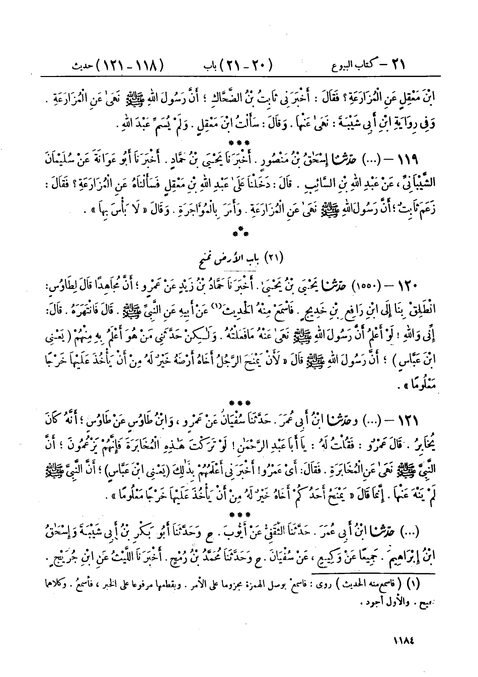 119 - (1549) حَدَّثَنَا إِسْحَاقُ بْنُ مَنْصُورٍ، أَخْبَرَنَا يَحْيَى بْنُ حَمَّادٍ، أَخْبَرَنَا أَبُو عَوَانَةَ، عَنْ سُلَيْمَانَ الشَّيْبَانِيِّ، عَنْ عَبْدِ اللهِ بْنِ السَّائِبِ، قَالَ: دَخَلْنَا عَلَى عَبْدِ اللهِ بْنِ مَعْقِلٍ، فَسَأَلْنَاهُ عَنِ الْمُزَارَعَةِ، فَقَالَ: زَعَمَ ثَابِتٌ، أَنَّ رَسُولَ اللهِ صَلَّى اللهُ عَلَيْهِ وَسَلَّمَ §نَهَى عَنِ الْمُزَارَعَةِ، وَأَمَرَ بِالْمُؤَاجَرَةِ، وَقَالَ: «لَا بَأْسَ بِهَا»