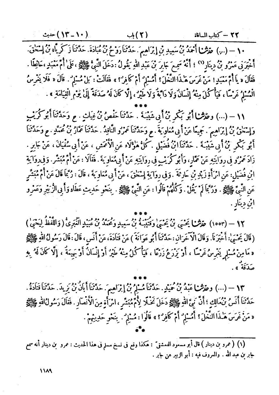 10 - (1552) حَدَّثَنَا أَحْمَدُ بْنُ سَعِيدِ بْنِ إِبْرَاهِيمَ، حَدَّثَنَا رَوْحُ بْنُ عُبَادَةَ، حَدَّثَنَا زَكَرِيَّا بْنُ إِسْحَاقَ، أَخْبَرَنِي عَمْرُو بْنُ دِينَارٍ، أَنَّهُ سَمِعَ جَابِرَ بْنَ عَبْدِ اللهِ، يَقُولُ: دَخَلَ النَّبِيُّ صَلَّى اللهُ عَلَيْهِ وَسَلَّمَ عَلَى أُمِّ مَعْبَدٍ حَائِطًا، فَقَالَ: «يَا أُمَّ مَعْبَدٍ، مَنْ غَرَسَ هَذَا النَّخْلَ؟ أَمُسْلِمٌ أَمْ كَافِرٌ؟» فَقَالَتْ: بَلْ مُسْلِمٌ، قَالَ: «§فَلَا يَغْرِسُ الْمُسْلِمُ غَرْسًا، فَيَأْكُلَ مِنْهُ إِنْسَانٌ، وَلَا دَابَّةٌ، وَلَا طَيْرٌ، إِلَّا كَانَ لَهُ صَدَقَةً إِلَى يَوْمِ الْقِيَامَةِ»،