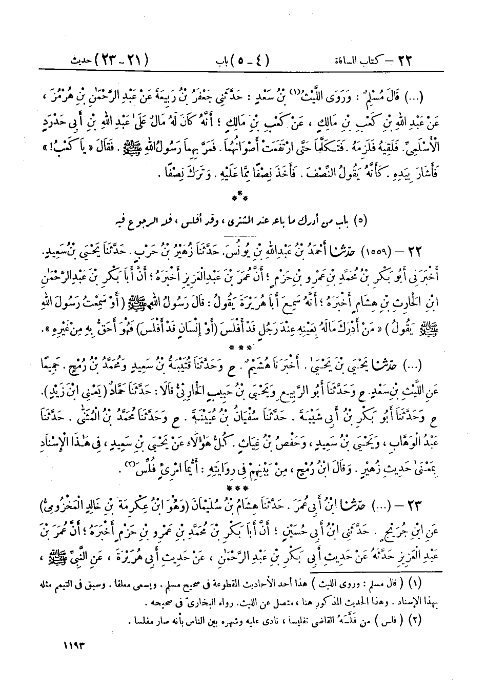 (1559) - حَدَّثَنَا يَحْيَى بْنُ يَحْيَى، أَخْبَرَنَا هُشَيْمٌ، ح وحَدَّثَنَا قُتَيْبَةُ بْنُ سَعِيدٍ، وَمُحَمَّدُ بْنُ رُمْحٍ، جَمِيعًا عَنِ اللَّيْثِ بْنِ سَعْدٍ، ح وحَدَّثَنَا أَبُو الرَّبِيعِ، وَيَحْيَى بْنُ حَبِيبٍ الْحَارِثِيُّ، قَالَا: حَدَّثَنَا حَمَّادٌ يَعْنِي ابْنَ زَيْدٍ، ح وحَدَّثَنَا أَبُو بَكْرِ بْنُ أَبِي شَيْبَةَ، حَدَّثَنَا سُفْيَانُ بْنُ عُيَيْنَةَ، ح وحَدَّثَنَا مُحَمَّدُ بْنُ الْمُثَنَّى، حَدَّثَنَا عَبْدُ الْوَهَّابِ، وَيَحْيَى بْنُ سَعِيدٍ، وَحَفْصُ بْنُ غِيَاثٍ، كُلُّ هَؤُلَاءِ، عَنْ يَحْيَى بْنِ سَعِيدٍ، فِي هَذَا الْإِسْنَادِ بِمَعْنَى حَدِيثِ زُهَيْرٍ، وقَالَ ابْنُ رُمْحٍ مِنْ بَيْنِهِمْ فِي رِوَايَتِهِ: «أَيُّمَا امْرِئٍ فُلِّسَ»