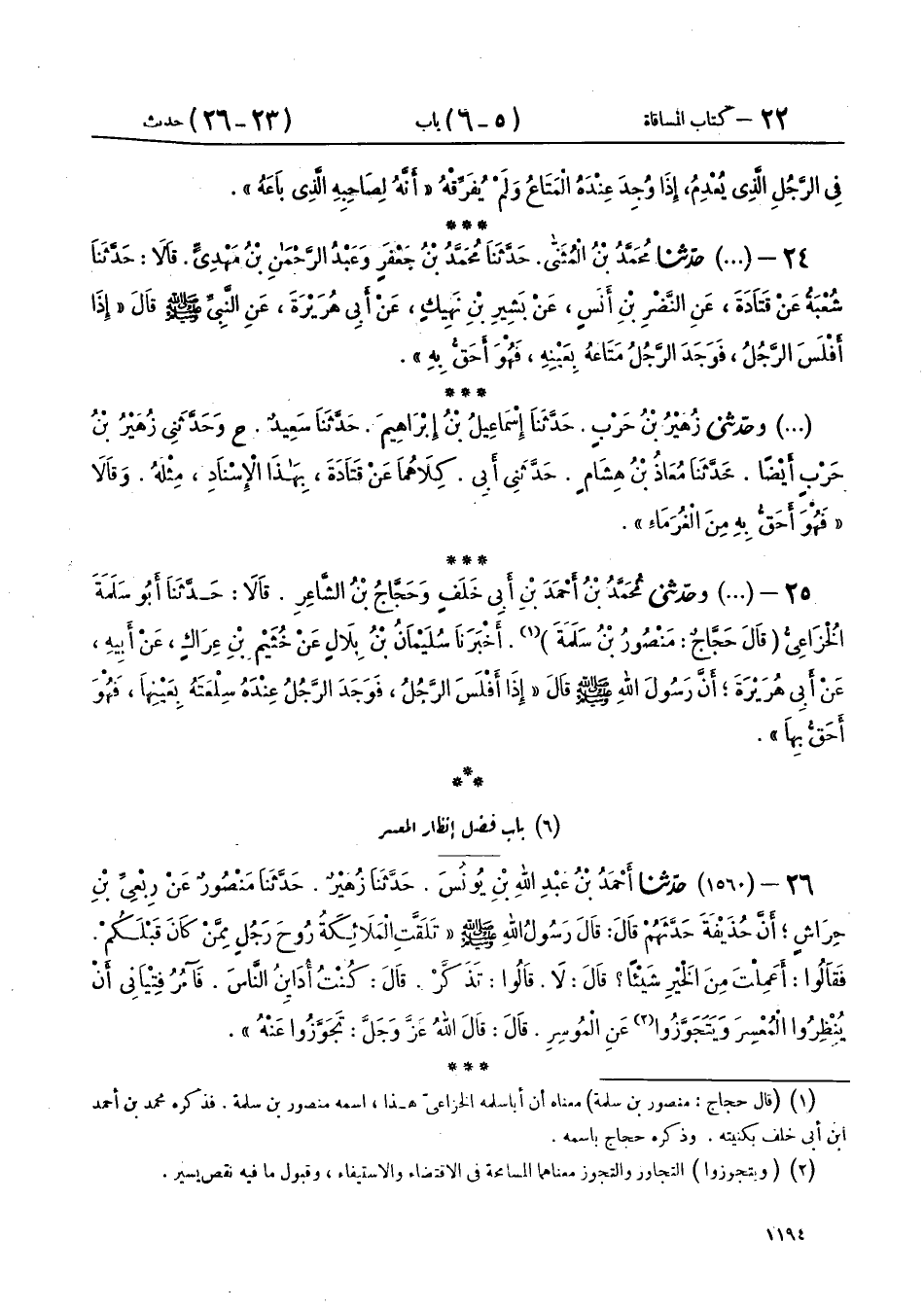 26 - (1560) حَدَّثَنَا أَحْمَدُ بْنُ عَبْدِ اللهِ بْنِ يُونُسَ، حَدَّثَنَا زُهَيْرٌ، حَدَّثَنَا مَنْصُورٌ، عَنْ رِبْعِيِّ بْنِ حِرَاشٍ، أَنَّ حُذَيْفَةَ، حَدَّثَهُمْ، قَالَ: قَالَ رَسُولُ اللهِ صَلَّى اللهُ عَلَيْهِ وَسَلَّمَ: " تَلَقَّتِ الْمَلَائِكَةُ رُوحَ رَجُلٍ مِمَّنْ كَانَ قَبْلَكُمْ، فَقَالُوا: أَعَمِلْتَ مِنَ الْخَيْرِ شَيْئًا؟ قَالَ: لَا، قَالُوا: تَذَكَّرْ، قَالَ: كُنْتُ أُدَايِنُ النَّاسَ فَآمُرُ فِتْيَانِي أَنْ يُنْظِرُوا الْمُعْسِرَ، وَيَتَجَوَّزُوا عَنِ الْمُوسِرِ، قَالَ: قَالَ اللهُ عَزَّ وَجَلَّ: §تَجَوَّزُوا عَنْهُ "