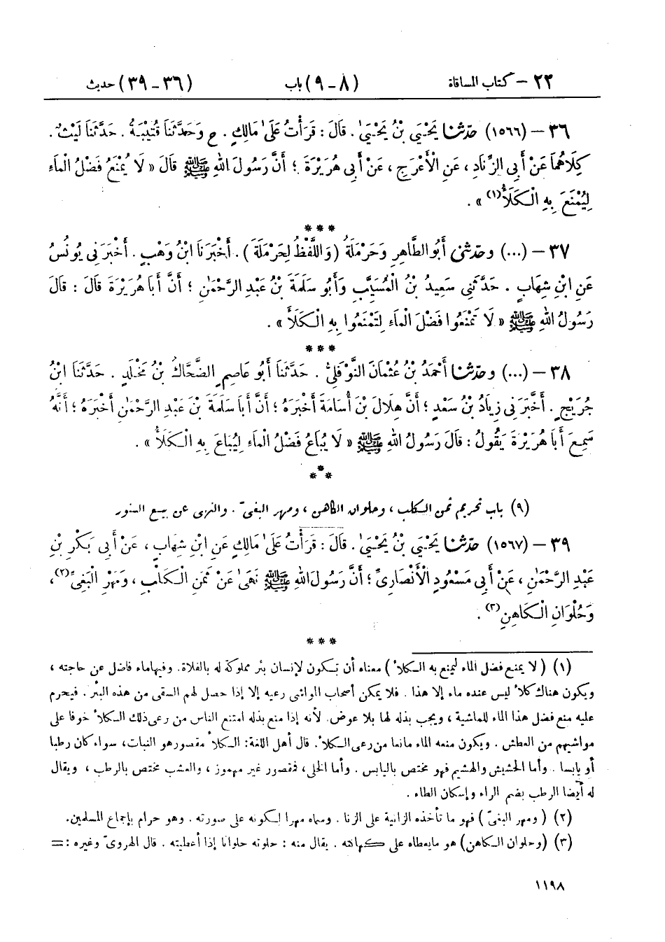 36 - (1566) حَدَّثَنَا يَحْيَى بْنُ يَحْيَى، قَالَ: قَرَأْتُ عَلَى مَالِكٍ، ح وحَدَّثَنَا قُتَيْبَةُ، حَدَّثَنَا لَيْثٌ كِلَاهُمَا، عَنْ أَبِي الزِّنَادِ، عَنِ الْأَعْرَجِ، عَنْ أَبِي هُرَيْرَةَ، أَنَّ رَسُولَ اللهِ صَلَّى اللهُ عَلَيْهِ وَسَلَّمَ قَالَ: «§لَا يُمْنَعُ فَضْلُ الْمَاءِ لِيُمْنَعَ بِهِ الْكَلَأُ»