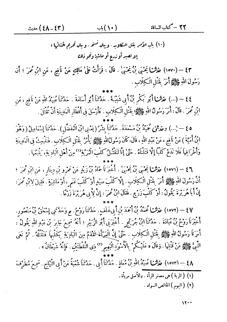 43 - (1570) حَدَّثَنَا يَحْيَى بْنُ يَحْيَى، قَالَ: قَرَأْتُ عَلَى مَالِكٍ، عَنْ نَافِعٍ، عَنِ ابْنِ عُمَرَ، «أَنَّ رَسُولَ اللهِ صَلَّى اللهُ عَلَيْهِ وَسَلَّمَ §أَمَرَ بِقَتْلِ الْكِلَابِ»
