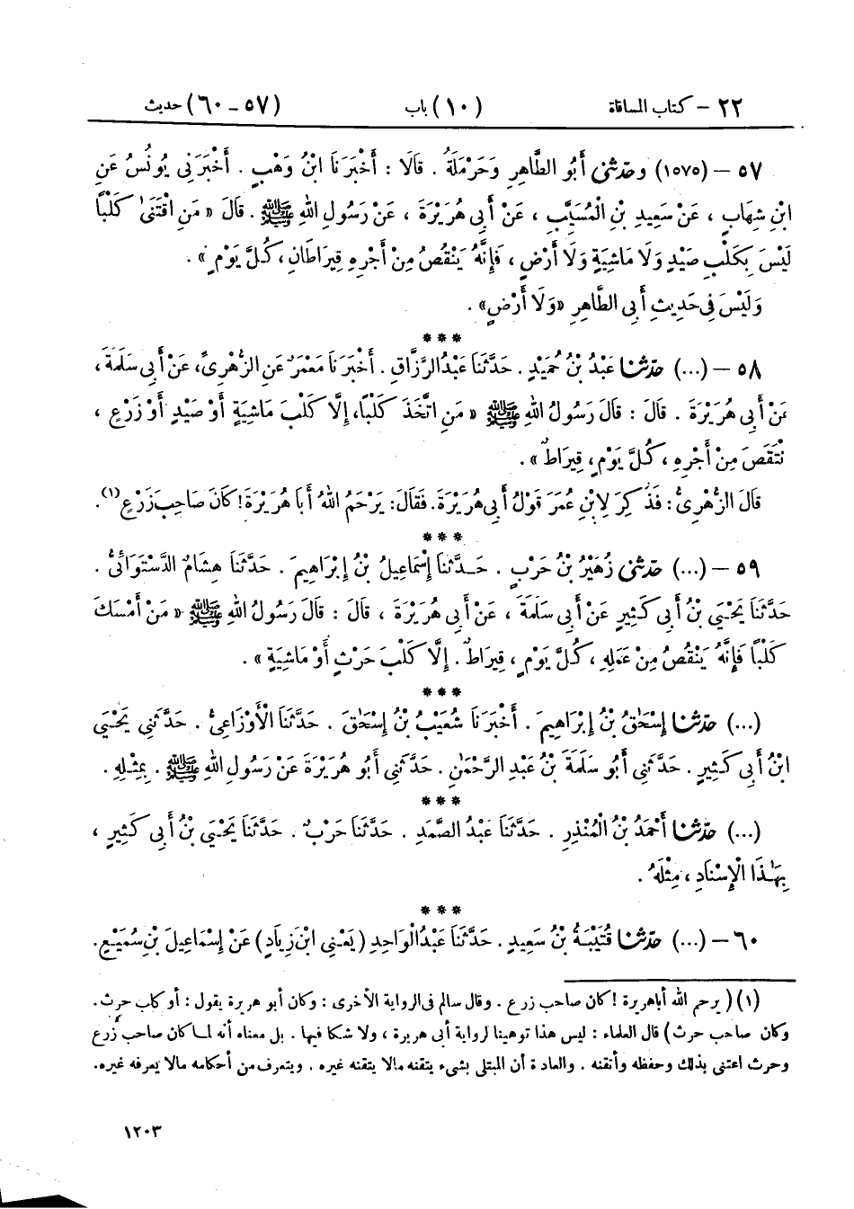 58 - (1575) حَدَّثَنَا عَبْدُ بْنُ حُمَيْدٍ، حَدَّثَنَا عَبْدُ الرَّزَّاقِ، أَخْبَرَنَا مَعْمَرٌ، عَنِ الزُّهْرِيِّ، عَنْ أَبِي سَلَمَةَ، عَنْ أَبِي هُرَيْرَةَ، قَالَ: قَالَ رَسُولُ اللهِ صَلَّى اللهُ عَلَيْهِ وَسَلَّمَ: «§مَنِ اتَّخَذَ كَلْبًا إِلَّا كَلْبَ مَاشِيَةٍ، أَوْ صَيْدٍ، أَوْ زَرْعٍ، انْتَقَصَ مِنْ أَجْرِهِ كُلَّ يَوْمٍ قِيرَاطٌ»، قَالَ الزُّهْرِيُّ: فَذُكِرَ لِابْنِ عُمَرَ قَوْلُ أَبِي هُرَيْرَةَ، فَقَالَ: «يَرْحَمُ اللهُ أَبَا هُرَيْرَةَ كَانَ صَاحِبَ زَرْعٍ»