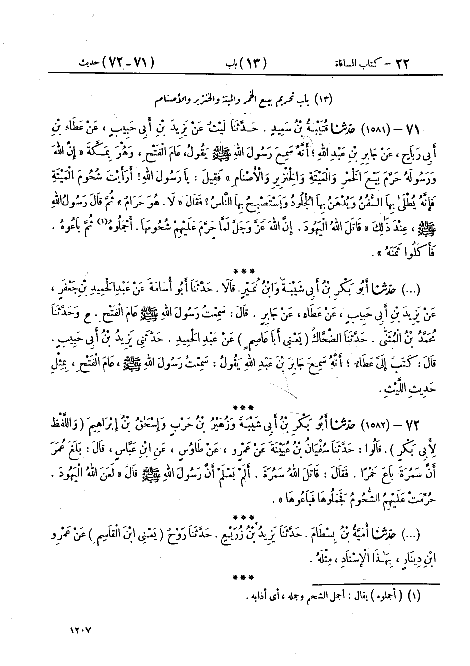 71 - (1581) حَدَّثَنَا قُتَيْبَةُ بْنُ سَعِيدٍ، حَدَّثَنَا لَيْثٌ، عَنْ يَزِيدَ بْنِ أَبِي حَبِيبٍ، عَنْ عَطَاءِ بْنِ أَبِي رَبَاحٍ، عَنْ جَابِرِ بْنِ عَبْدِ اللهِ، أَنَّهُ سَمِعَ رَسُولَ اللهِ صَلَّى اللهُ عَلَيْهِ وَسَلَّمَ يَقُولُ عَامَ الْفَتْحِ وَهُوَ بِمَكَّةَ: «إِنَّ §اللهَ وَرَسُولَهُ حَرَّمَ بَيْعَ الْخَمْرِ، وَالْمَيْتَةِ، وَالْخِنْزِيرِ، وَالْأَصْنَامِ»، فَقِيلَ: يَا رَسُولَ اللهِ، أَرَأَيْتَ شُحُومَ الْمَيْتَةِ، فَإِنَّهُ يُطْلَى بِهَا السُّفُنُ، وَيُدْهَنُ بِهَا الْجُلُودُ، وَيَسْتَصْبِحُ بِهَا النَّاسُ، فَقَالَ: «لَا، هُوَ حَرَامٌ»، ثُمَّ قَالَ رَسُولُ اللهِ صَلَّى اللهُ عَلَيْهِ وَسَلَّمَ عِنْدَ ذَلِكَ: «قَاتَلَ اللهُ الْيَهُودَ، إِنَّ اللهَ عَزَّ وَجَلَّ لَمَّا حَرَّمَ عَلَيْهِمْ شُحُومَهَا أَجْمَلُوهُ، ثُمَّ بَاعُوهُ فَأَكَلُوا ثَمَنَهُ»،