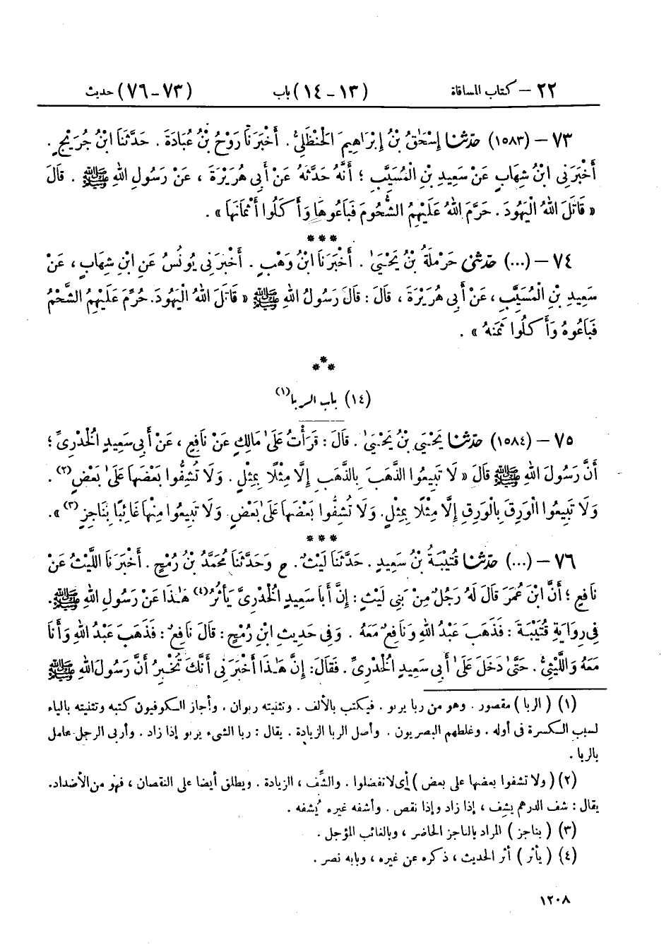 76 - (1584) حَدَّثَنَا قُتَيْبَةُ بْنُ سَعِيدٍ، حَدَّثَنَا لَيْثٌ، ح وحَدَّثَنَا مُحَمَّدُ بْنُ رُمْحٍ، أَخْبَرَنَا اللَّيْثُ، عَنْ نَافِعٍ، أَنَّ ابْنَ عُمَرَ، قَالَ لَهُ رَجُلٌ مِنْ بَنِي لَيْثٍ: إِنَّ أَبَا سَعِيدٍ الْخُدْرِيَّ، يَأْثُرُ هَذَا عَنْ رَسُولِ اللهِ صَلَّى اللهُ عَلَيْهِ وَسَلَّمَ فِي رِوَايَةِ قُتَيْبَةَ، فَذَهَبَ عَبْدُ اللهِ، وَنَافِعٌ مَعَهُ، وَفِي حَدِيثِ ابْنِ رُمْحٍ: قَالَ نَافِعٌ: فَذَهَبَ عَبْدُ اللهِ وَأَنَا مَعَهُ وَاللَّيْثِيُّ، حَتَّى دَخَلَ عَلَى أَبِي سَعِيدٍ الْخُدْرِيِّ، فَقَالَ: إِنَّ هَذَا أَخْبَرَنِي أَنَّكَ تُخْبِرُ، أَنَّ رَسُولَ اللهِ صَلَّى اللهُ عَلَيْهِ وَسَلَّمَ نَهَى عَنْ بَيْعِ الْوَرِقِ بِالْوَرِقِ إِلَّا مِثْلًا بِمِثْلٍ، وَعَنْ بَيْعِ الذَّهَبِ بِالذَّهَبِ إِلَّا مِثْلًا بِمِثْلٍ "، فَأَشَارَ أَبُو سَعِيدٍ بِإِصْبَعَيْهِ إِلَى عَيْنَيْهِ وَأُذُنَيْهِ، فَقَالَ: أَبْصَرَتْ عَيْنَايَ، وَسَمِعَتْ أُذُنَايَ رَسُولَ اللهِ صَلَّى اللهُ عَلَيْهِ وَسَلَّمَ يَقُولُ: «§لَا تَبِيعُوا الذَّهَبَ بِالذَّهَبِ، وَلَا تَبِيعُوا الْوَرِقَ بِالْوَرِقِ، إِلَّا مِثْلًا بِمِثْلٍ، وَلَا تُشِفُّوا بَعْضَهُ عَلَى بَعْضٍ، وَلَا تَبِيعُوا شَيْئًا غَائِبًا مِنْهُ بِنَاجِزٍ، إِلَّا يَدًا بِيَدٍ»،