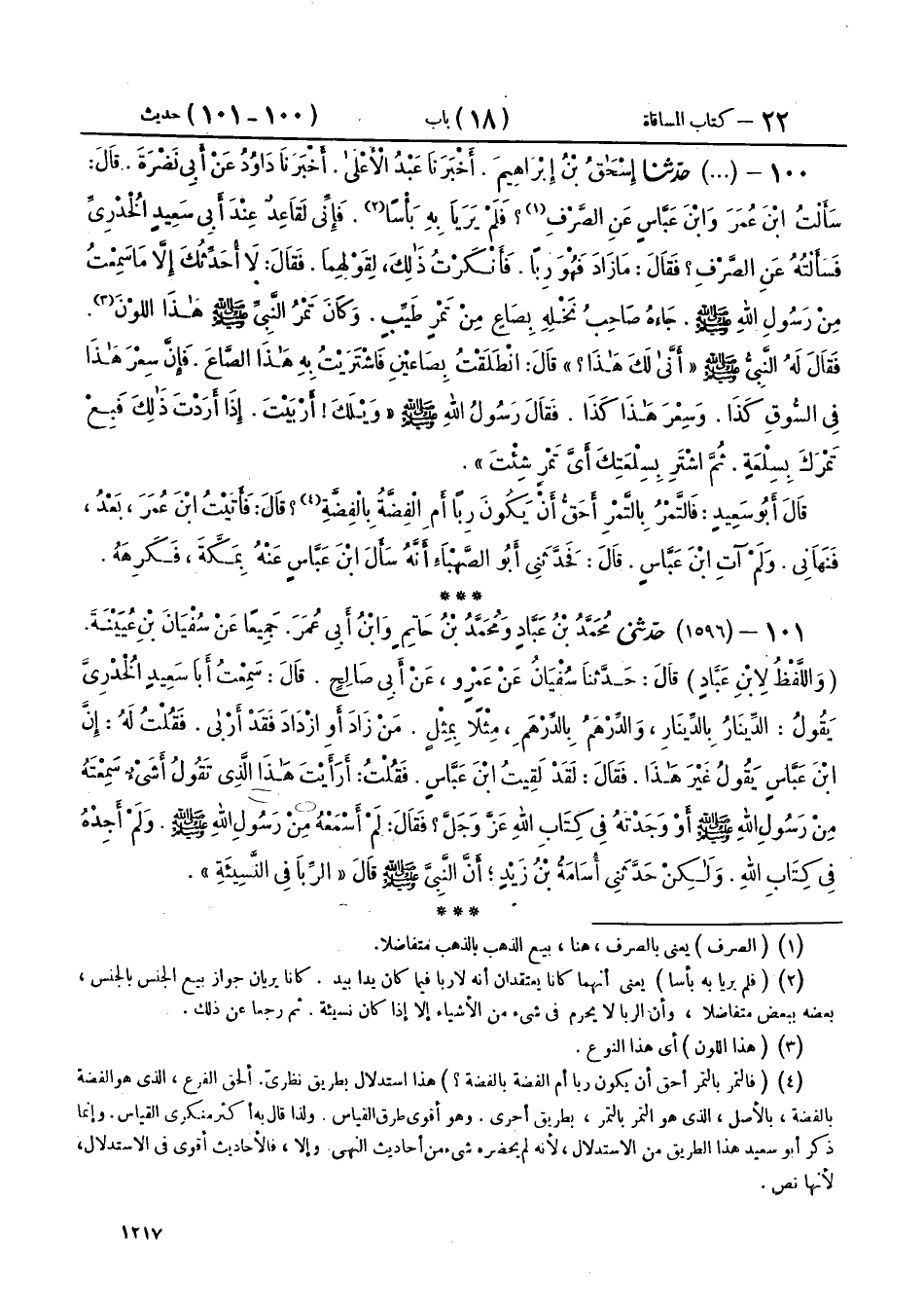 101 - (1596) حَدَّثَنِي مُحَمَّدُ بْنُ عَبَّادٍ، وَمُحَمَّدُ بْنُ حَاتِمٍ، وَابْنُ أَبِي عُمَرَ، جَمِيعًا عَنْ سُفْيَانَ بْنِ عُيَيْنَةَ، وَاللَّفْظُ لِابْنِ عَبَّادٍ، قَالَ: حَدَّثَنَا سُفْيَانُ، عَنْ عَمْرٍو، عَنْ أَبِي صَالِحٍ، قَالَ: سَمِعْتُ أَبَا سَعِيدٍ الْخُدْرِيَّ، يَقُولُ: الدِّينَارُ بِالدِّينَارِ، وَالدِّرْهَمُ بِالدِّرْهَمِ، مِثْلًا بِمِثْلٍ، مَنْ زَادَ، أَوِ ازْدَادَ، فَقَدْ أَرْبَى، فَقُلْتُ لَهُ: إِنَّ ابْنَ عَبَّاسٍ، يَقُولُ غَيْرَ هَذَا، فَقَالَ: لَقَدْ لَقِيتُ ابْنَ عَبَّاسٍ، فَقُلْتُ: أَرَأَيْتَ هَذَا الَّذِي تَقُولُ؟ أَشَيْءٌ سَمِعْتَهُ مِنْ رَسُولِ اللهِ صَلَّى اللهُ عَلَيْهِ وَسَلَّمَ، أَوْ وَجَدْتَهُ فِي كِتَابِ اللهِ عَزَّ وَجَلَّ، فَقَالَ: لَمْ أَسْمَعْهُ مِنْ رَسُولِ اللهِ صَلَّى اللهُ عَلَيْهِ وَسَلَّمَ، وَلَمْ أَجِدْهُ فِي كِتَابِ اللهِ، وَلَكِنْ حَدَّثَنِي أُسَامَةُ بْنُ زَيْدٍ، أَنَّ النَّبِيَّ صَلَّى اللهُ عَلَيْهِ وَسَلَّمَ قَالَ: «§الرِّبَا فِي النَّسِيئَةِ»
