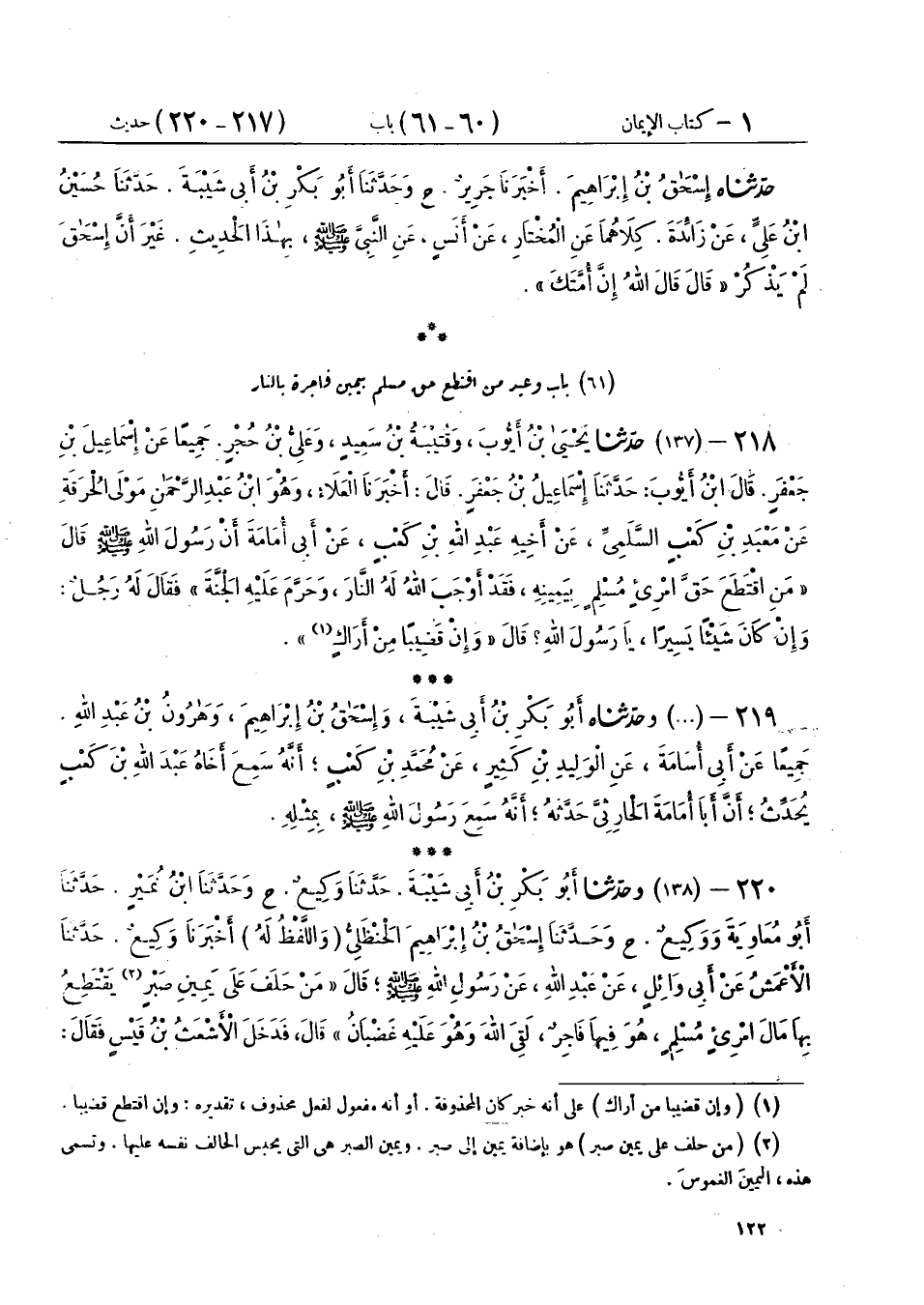 220 - (138) وَحَدَّثَنَا أَبُو بَكْرِ بْنُ أَبِي شَيْبَةَ، حَدَّثَنَا وَكِيعٌ، ح، وَحَدَّثَنَا ابْنُ نُمَيْرٍ، حَدَّثَنَا أَبُو مُعَاوِيَةَ، وَوَكِيعٌ، ح، وَحَدَّثَنَا إِسْحَاقُ بْنُ إِبْرَاهِيمَ الْحَنْظَلِيُّ، وَاللَّفْظُ لَهُ، أَخْبَرَنَا وَكِيعٌ، حَدَّثَنَا الْأَعْمَشُ، عَنْ أَبِي وَائِلٍ، عَنْ عَبْدِ اللهِ، عَنْ رَسُولِ اللهِ صَلَّى اللهُ عَلَيْهِ وَسَلَّمَ قَالَ: «§مَنْ حَلَفَ عَلَى يَمِينِ صَبْرٍ، يَقْتَطِعُ بِهَا مَالَ امْرِئٍ مُسْلِمٍ هُوَ فِيهَا فَاجِرٌ، لَقِيَ اللهَ وَهُوَ عَلَيْهِ غَضْبَانُ»، قَالَ: فَدَخَلَ الْأَشْعَثُ بْنُ قَيْسٍ، فَقَالَ: مَا يُحَدِّثُكُمْ أَبُو عَبْدِ الرَّحْمَنِ؟ قَالُوا: كَذَا وَكَذَا، قَالَ: صَدَقَ أَبُو عَبْدِ الرَّحْمَنِ، فِيَّ نَزَلَتْ، كَانَ بَيْنِي وَبَيْنَ رَجُلٍ أَرْضٌ بِالْيَمَنِ، فَخَاصَمْتُهُ إِلَى النَّبِيِّ صَلَّى اللهُ عَلَيْهِ وَسَلَّمَ فَقَالَ: «هَلْ لَكَ بَيِّنَةٌ؟» فَقُلْتُ: لَا، قَالَ: «فَيَمِينُهُ»، قُلْتُ: إِذَنْ يَحْلِفُ، فَقَالَ رَسُولُ اللهِ صَلَّى اللهُ عَلَيْهِ وَسَلَّمَ عِنْدَ ذَلِكَ: «مَنْ حَلَفَ عَلَى يَمِينِ صَبْرٍ، يَقْتَطِعُ بِهَا مَالَ امْرِئٍ مُسْلِمٍ هُوَ فِيهَا فَاجِرٌ، لَقِيَ اللهَ وَهُوَ عَلَيْهِ غَضْبَانُ» فَنَزَلَتْ: {إِنَّ الَّذِينَ يَشْتَرُونَ بِعَهْدِ اللهِ وَأَيْمَانِهِمْ ثَمَنًا قَلِيلًا} [آل عمران: 77] إِلَى آخِرِ الْآيَةِ