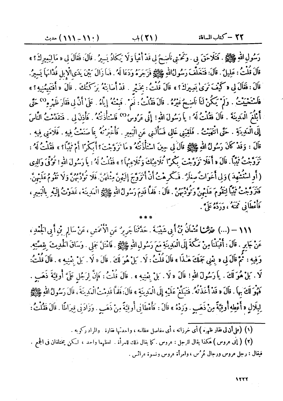 111 - (715) حَدَّثَنَا عُثْمَانُ بْنُ أَبِي شَيْبَةَ، حَدَّثَنَا جَرِيرٌ، عَنِ الْأَعْمَشِ، عَنْ سَالِمِ بْنِ أَبِي الْجَعْدِ، عَنْ جَابِرٍ، قَالَ: أَقْبَلْنَا مِنْ مَكَّةَ إِلَى الْمَدِينَةِ مَعَ رَسُولِ اللهِ صَلَّى اللهُ عَلَيْهِ وَسَلَّمَ فَاعْتَلَّ جَمَلِي، وَسَاقَ الْحَدِيثَ بِقِصَّتِهِ، وَفِيهِ ثُمَّ قَالَ لِي: «بِعْنِي جَمَلَكَ هَذَا»، قَالَ: قُلْتُ: لَا، بَلْ هُوَ لَكَ، قَالَ: «لَا، بَلْ بِعْنِيهِ» قَالَ: قُلْتُ: لَا، بَلْ هُوَ لَكَ يَا رَسُولَ اللهِ، قَالَ: «لَا، بَلْ بِعْنِيهِ»، قَالَ: قُلْتُ: فَإِنَّ لِرَجُلٍ عَلَيَّ أُوقِيَّةَ ذَهَبٍ، فَهُوَ لَكَ بِهَا، قَالَ: «قَدْ أَخَذْتُهُ، فَتَبَلَّغْ عَلَيْهِ إِلَى الْمَدِينَةِ»، قَالَ: فَلَمَّا قَدِمْتُ الْمَدِينَةَ، قَالَ رَسُولُ اللهِ صَلَّى اللهُ عَلَيْهِ وَسَلَّمَ لِبِلَالٍ: «أَعْطِهِ أُوقِيَّةً مِنْ ذَهَبٍ وَزِدْهُ»، قَالَ: فَأَعْطَانِي أُوقِيَّةً مِنْ ذَهَبٍ، وَزَادَنِي قِيرَاطًا، قَالَ: فَقُلْتُ: لَا تُفَارِقُنِي زِيَادَةُ رَسُولِ اللهِ صَلَّى اللهُ عَلَيْهِ وَسَلَّمَ، قَالَ: فَكَانَ فِي كِيسٍ لِي فَأَخَذَهُ أَهْلُ الشَّامِ يَوْمَ الْحَرَّةِ.