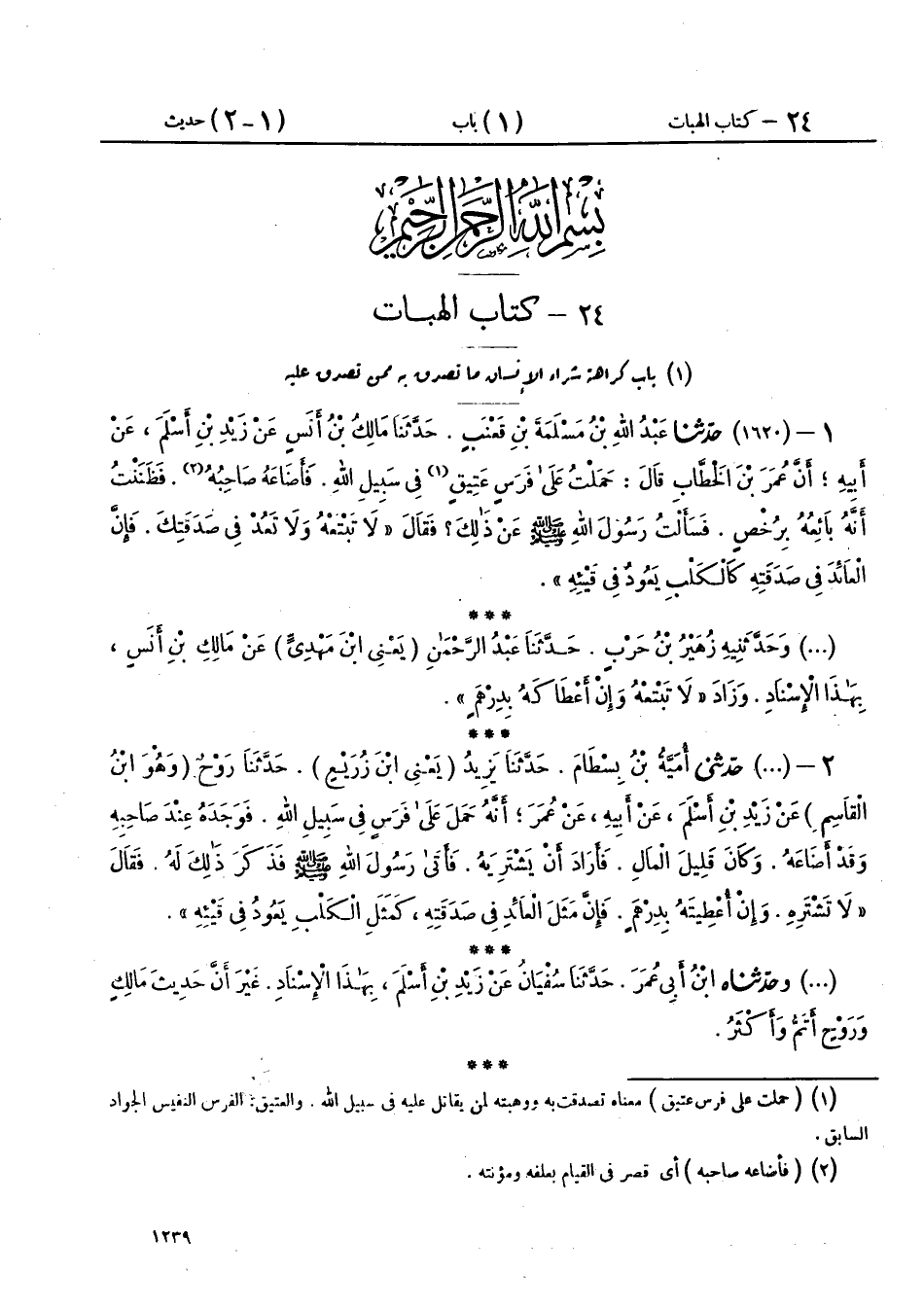 1 - (1620) حَدَّثَنَا عَبْدُ اللهِ بْنُ مَسْلَمَةَ بْنِ قَعْنَبٍ، حَدَّثَنَا مَالِكُ بْنُ أَنَسٍ، عَنْ زَيْدِ بْنِ أَسْلَمَ، عَنْ أَبِيهِ، أَنَّ عُمَرَ بْنَ الْخَطَّابِ، قَالَ: حَمَلْتُ عَلَى فَرَسٍ عَتِيقٍ فِي سَبِيلِ اللهِ، فَأَضَاعَهُ صَاحِبُهُ، فَظَنَنْتُ أَنَّهُ بَائِعُهُ بِرُخْصٍ، فَسَأَلْتُ رَسُولَ اللهِ صَلَّى اللهُ عَلَيْهِ وَسَلَّمَ عَنْ ذَلِكَ، فَقَالَ: «§لَا تَبْتَعْهُ، وَلَا تَعُدْ فِي صَدَقَتِكَ، فَإِنَّ الْعَائِدَ فِي صَدَقَتِهِ كَالْكَلْبِ يَعُودُ فِي قَيْئِهِ»،
