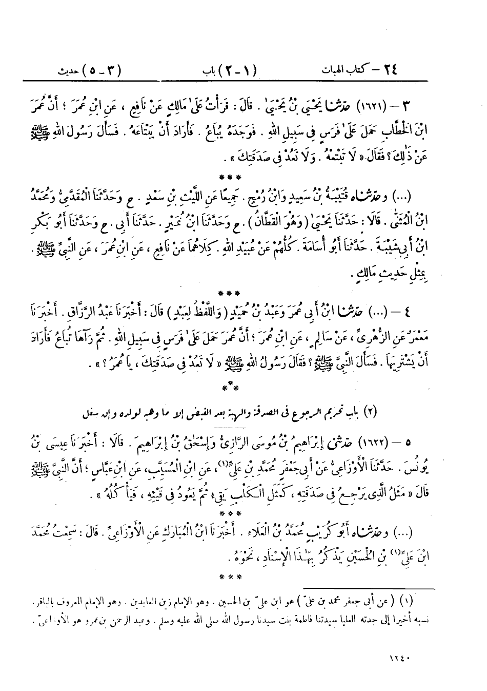 3 - (1621) حَدَّثَنَا يَحْيَى بْنُ يَحْيَى، قَالَ: قَرَأْتُ عَلَى مَالِكٍ، عَنْ نَافِعٍ، عَنِ ابْنِ عُمَرَ، أَنَّ عُمَرَ بْنَ الْخَطَّابِ، حَمَلَ عَلَى فَرَسٍ فِي سَبِيلِ اللهِ فَوَجَدَهُ يُبَاعُ، فَأَرَادَ أَنْ يَبْتَاعَهُ، فَسَأَلَ رَسُولَ اللهِ صَلَّى اللهُ عَلَيْهِ وَسَلَّمَ عَنْ ذَلِكَ، فَقَالَ: «§لَا تَبْتَعْهُ، وَلَا تَعُدْ فِي صَدَقَتِكَ»،