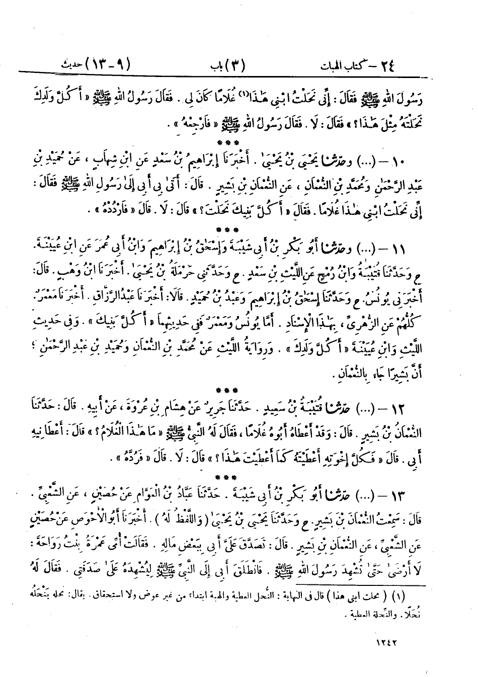 12 - (1623) حَدَّثَنَا قُتَيْبَةُ بْنُ سَعِيدٍ، حَدَّثَنَا جَرِيرٌ، عَنْ هِشَامِ بْنِ عُرْوَةَ، عَنْ أَبِيهِ، قَالَ: حَدَّثَنَا النُّعْمَانُ بْنُ بَشِيرٍ، قَالَ: وَقَدْ أَعْطَاهُ أَبُوهُ غُلَامًا، فَقَالَ لَهُ النَّبِيُّ صَلَّى اللهُ عَلَيْهِ وَسَلَّمَ: «مَا هَذَا الْغُلَامُ؟» قَالَ: أَعْطَانِيهِ أَبِي، قَالَ: «§فَكُلَّ إِخْوَتِهِ أَعْطَيْتَهُ كَمَا أَعْطَيْتَ هَذَا؟» قَالَ: لَا، قَالَ: «فَرُدَّهُ»