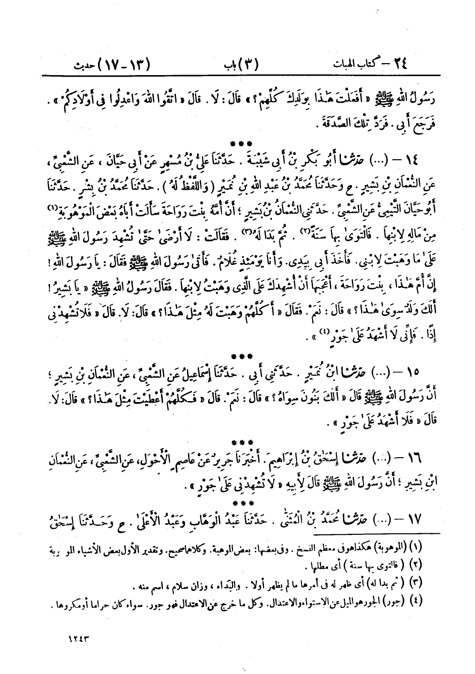 14 - (1623) حَدَّثَنَا أَبُو بَكْرِ بْنُ أَبِي شَيْبَةَ، حَدَّثَنَا عَلِيُّ بْنُ مُسْهِرٍ، عَنْ أَبِي حَيَّانَ، عَنِ الشَّعْبِيِّ، عَنِ النُّعْمَانِ بْنِ بَشِيرٍ، ح وحَدَّثَنَا مُحَمَّدُ بْنُ عَبْدِ اللهِ بْنِ نُمَيْرٍ، وَاللَّفْظُ لَهُ، حَدَّثَنَا مُحَمَّدُ بْنُ بِشْرٍ، حَدَّثَنَا أَبُو حَيَّانَ التَّيْمِيُّ، عَنِ الشَّعْبِيِّ، حَدَّثَنِي النُّعْمَانُ بْنُ بَشِيرٍ، أَنَّ أُمَّهُ بِنْتَ رَوَاحَةَ، سَأَلَتْ أَبَاهُ بَعْضَ الْمَوْهِبَةِ مِنْ مَالِهِ لِابْنِهَا، فَالْتَوَى بِهَا سَنَةً ثُمَّ بَدَا لَهُ، فَقَالَتْ: لَا أَرْضَى حَتَّى تُشْهِدَ رَسُولَ اللهِ صَلَّى اللهُ عَلَيْهِ وَسَلَّمَ عَلَى مَا وَهَبْتَ لِابْنِي، فَأَخَذَ أَبِي بِيَدِي وَأَنَا يَوْمَئِذٍ غُلَامٌ، فَأَتَى رَسُولَ اللهِ صَلَّى اللهُ عَلَيْهِ وَسَلَّمَ، فَقَالَ: يَا رَسُولَ اللهِ، إِنَّ أُمَّ هَذَا بِنْتَ رَوَاحَةَ أَعْجَبَهَا أَنْ أُشْهِدَكَ عَلَى الَّذِي وَهَبْتُ لِابْنِهَا، فَقَالَ رَسُولُ اللهِ صَلَّى اللهُ عَلَيْهِ وَسَلَّمَ: «يَا بَشِيرُ أَلَكَ وَلَدٌ سِوَى هَذَا؟» قَالَ: نَعَمْ، فَقَالَ: «§أَكُلَّهُمْ وَهَبْتَ لَهُ مِثْلَ هَذَا؟» قَالَ: لَا، قَالَ: «فَلَا تُشْهِدْنِي إِذًا، فَإِنِّي لَا أَشْهَدُ عَلَى جَوْرٍ»