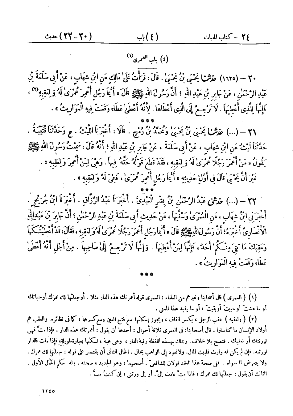 22 - (1625) حَدَّثَنِي عَبْدُ الرَّحْمَنِ بْنُ بِشْرٍ الْعَبْدِيُّ، أَخْبَرَنَا عَبْدُ الرَّزَّاقِ، أَخْبَرَنَا ابْنُ جُرَيْجٍ، أَخْبَرَنِي ابْنُ شِهَابٍ، عَنِ الْعُمْرَى وَسُنَّتِهَا، عَنْ حَدِيثِ أَبِي سَلَمَةَ بْنِ عَبْدِ الرَّحْمَنِ، أَنَّ جَابِرَ بْنَ عَبْدِ اللهِ الْأَنْصَارِيَّ، أَخْبَرَهُ، أَنَّ رَسُولَ اللهِ صَلَّى اللهُ عَلَيْهِ وَسَلَّمَ، قَالَ: " §أَيُّمَا رَجُلٍ أَعْمَرَ رَجُلًا عُمْرَى لَهُ وَلِعَقِبِهِ، فَقَالَ: قَدْ أَعْطَيْتُكَهَا وَعَقِبَكَ مَا بَقِيَ مِنْكُمْ أَحَدٌ، فَإِنَّهَا لِمَنْ أُعْطِيَهَا، وَإِنَّهَا لَا تَرْجِعُ إِلَى صَاحِبِهَا، مِنْ أَجْلِ أَنَّهُ أَعْطَى عَطَاءً وَقَعَتْ فِيهِ الْمَوَارِيثُ "