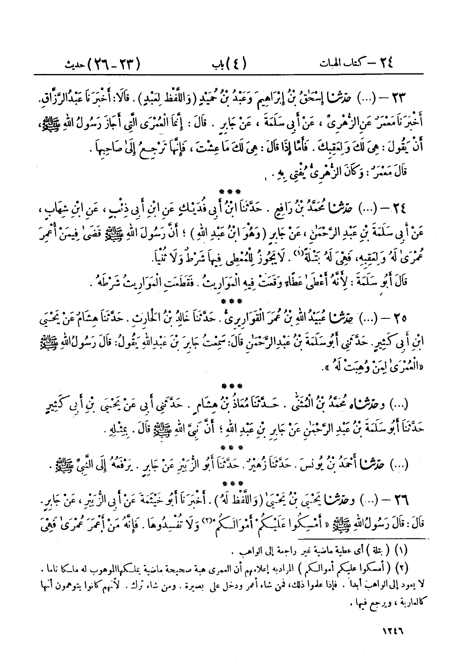 23 - (1625) حَدَّثَنَا إِسْحَاقُ بْنُ إِبْرَاهِيمَ، وَعَبْدُ بْنُ حُمَيْدٍ، وَاللَّفْظُ لِعَبْدٍ، قَالَا: أَخْبَرَنَا عَبْدُ الرَّزَّاقِ، أَخْبَرَنَا مَعْمَرٌ، عَنِ الزُّهْرِيِّ، عَنْ أَبِي سَلَمَةَ، عَنْ جَابِرٍ، قَالَ: " §إِنَّمَا الْعُمْرَى الَّتِي أَجَازَ رَسُولُ اللهِ صَلَّى اللهُ عَلَيْهِ وَسَلَّمَ أَنْ يَقُولَ: هِيَ لَكَ وَلِعَقِبِكَ، فَأَمَّا إِذَا قَالَ: هِيَ لَكَ مَا عِشْتَ، فَإِنَّهَا تَرْجِعُ إِلَى صَاحِبِهَا "، قَالَ مَعْمَرٌ: وَكَانَ الزُّهْرِيُّ يُفْتِي بِهِ