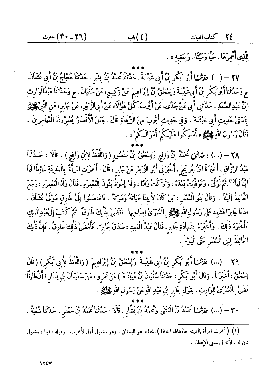 27 - (1625) حَدَّثَنَا أَبُو بَكْرِ بْنُ أَبِي شَيْبَةَ، حَدَّثَنَا مُحَمَّدُ بْنُ بِشْرٍ، حَدَّثَنَا حَجَّاجُ بْنُ أَبِي عُثْمَانَ، ح وحَدَّثَنَا أَبُو بَكْرِ بْنُ أَبِي شَيْبَةَ، وَإِسْحَاقُ بْنُ إِبْرَاهِيمَ، عَنْ وَكِيعٍ، عَنْ سُفْيَانَ، ح وحَدَّثَنَا عَبْدُ الْوَارِثِ بْنُ عَبْدِ الصَّمَدِ، حَدَّثَنِي أَبِي، عَنْ جَدِّي، عَنْ أَيُّوبَ، كُلُّ هَؤُلَاءِ عَنْ أَبِي الزُّبَيْرِ، عَنْ جَابِرٍ، عَنِ النَّبِيِّ صَلَّى اللهُ عَلَيْهِ وَسَلَّمَ بِمَعْنَى حَدِيثِ أَبِي خَيْثَمَةَ، وَفِي حَدِيثِ أَيُّوبَ مِنَ الزِّيَادَةِ: قَالَ: جَعَلَ الْأَنْصَارُ يُعْمِرُونَ الْمُهَاجِرِينَ، فَقَالَ رَسُولُ اللهِ صَلَّى اللهُ عَلَيْهِ وَسَلَّمَ: «أَمْسِكُوا عَلَيْكُمْ أَمْوَالَكُمْ»