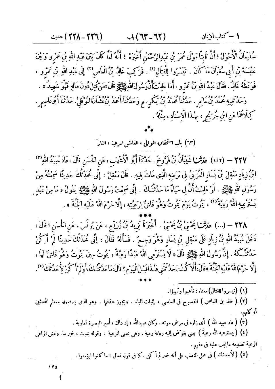 227 - (142) حَدَّثَنَا شَيْبَانُ بْنُ فَرُّوخَ، حَدَّثَنَا أَبُو الْأَشْهَبِ، عَنِ الْحَسَنِ، قَالَ: عَادَ عُبَيْدُ اللهِ بْنُ زِيَادٍ مَعْقِلَ بْنَ يَسَارٍ الْمُزَنِيَّ فِي مَرَضِهِ الَّذِي مَاتَ فِيهِ، قَالَ مَعْقِلٌ: إِنِّي مُحَدِّثُكَ حَدِيثًا سَمِعْتُهُ مِنْ رَسُولِ اللهِ صَلَّى اللهُ عَلَيْهِ وَسَلَّمَ، لَوْ عَلِمْتُ أَنَّ لِي حَيَاةً مَا حَدَّثْتُكَ، إِنِّي سَمِعْتُ رَسُولَ اللهِ صَلَّى اللهُ عَلَيْهِ وَسَلَّمَ يَقُولُ: «§مَا مِنْ عَبْدٍ يَسْتَرْعِيهِ اللهُ رَعِيَّةً، يَمُوتُ يَوْمَ يَمُوتُ وَهُوَ غَاشٌّ لِرَعِيَّتِهِ، إِلَّا حَرَّمَ اللهُ عَلَيْهِ الْجَنَّةَ»