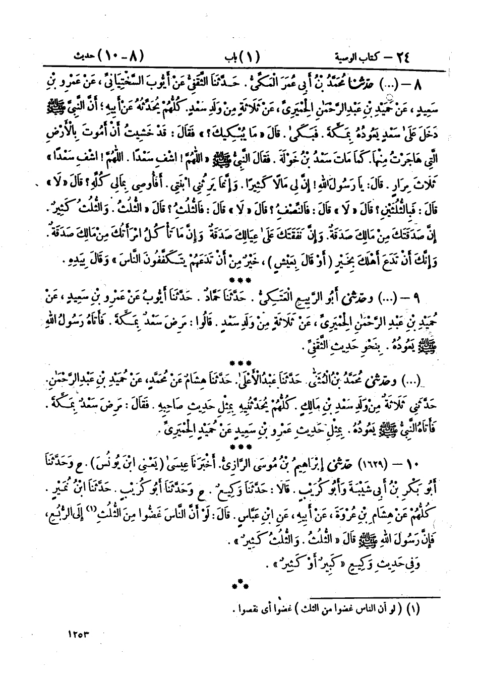 8 - (1628) حَدَّثَنَا مُحَمَّدُ بْنُ أَبِي عُمَرَ الْمَكِّيُّ، حَدَّثَنَا الثَّقَفِيُّ، عَنْ أَيُّوبَ السَّخْتِيَانِيِّ، عَنْ عَمْرِو بْنِ سَعِيدٍ، عَنْ حُمَيْدِ بْنِ عَبْدِ الرَّحْمَنِ الْحِمْيَرِيِّ، عَنْ ثَلَاثَةٍ مِنْ وَلَدِ سَعْدٍ، كُلُّهُمْ يُحَدِّثُهُ عَنْ أَبِيهِ، أَنَّ النَّبِيَّ صَلَّى اللهُ عَلَيْهِ وَسَلَّمَ دَخَلَ عَلَى سَعْدٍ يَعُودُهُ بِمَكَّةَ، فَبَكَى، قَالَ: «مَا يُبْكِيكَ؟» فَقَالَ: قَدْ خَشِيتُ أَنْ أَمُوتَ بِالْأَرْضِ الَّتِي هَاجَرْتُ مِنْهَا، كَمَا مَاتَ سَعْدُ بْنُ خَوْلَةَ، فَقَالَ النَّبِيُّ صَلَّى اللهُ عَلَيْهِ وَسَلَّمَ: «اللهُمَّ اشْفِ سَعْدًا، اللهُمَّ اشْفِ سَعْدًا» ثَلَاثَ مِرَارٍ، قَالَ: يَا رَسُولَ اللهِ، إِنَّ لِي مَالًا كَثِيرًا، وَإِنَّمَا يَرِثُنِي ابْنَتِي، أَفَأُوصِي بِمَالِي كُلِّهِ؟ قَالَ: «لَا»، قَالَ: فَبِالثُّلُثَيْنِ؟، قَالَ: «لَا»، قَالَ: «فَالنِّصْفُ؟» قَالَ: «لَا»، قَالَ: فَالثُّلُثُ؟ قَالَ: " §الثُّلُثُ وَالثُّلُثُ كَثِيرٌ، إِنَّ صَدَقَتَكَ مِنْ مَالِكَ صَدَقَةٌ، وَإِنَّ نَفَقَتَكَ عَلَى عِيَالِكَ صَدَقَةٌ، وَإِنَّ مَا تَأْكُلُ امْرَأَتُكَ مِنْ مَالِكَ صَدَقَةٌ، وَإِنَّكَ أَنْ تَدَعَ أَهْلَكَ بِخَيْرٍ - أَوْ قَالَ: بِعَيْشٍ - خَيْرٌ مِنْ أَنْ تَدَعَهُمْ يَتَكَفَّفُونَ النَّاسَ " وَقَالَ: بِيَدِهِ،