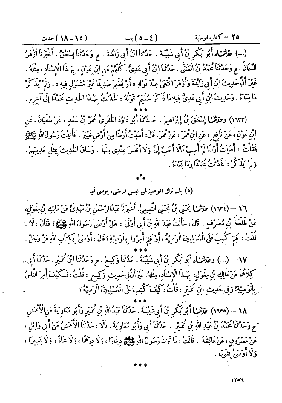 18 - (1635) حَدَّثَنَا أَبُو بَكْرِ بْنُ أَبِي شَيْبَةَ، حَدَّثَنَا عَبْدُ اللهِ بْنُ نُمَيْرٍ، وَأَبُو مُعَاوِيَةَ، عَنِ الْأَعْمَشِ، ح وحَدَّثَنَا مُحَمَّدُ بْنُ عَبْدِ اللهِ بْنِ نُمَيْرٍ، حَدَّثَنَا أَبِي، وَأَبُو مُعَاوِيَةَ، قَالَا: حَدَّثَنَا الْأَعْمَشُ، عَنْ أَبِي وَائِلٍ، عَنْ مَسْرُوقٍ، عَنْ عَائِشَةَ، قَالَتْ: «§مَا تَرَكَ رَسُولُ اللهِ صَلَّى اللهُ عَلَيْهِ وَسَلَّمَ دِينَارًا، وَلَا دِرْهَمًا، وَلَا شَاةً، وَلَا بَعِيرًا، وَلَا أَوْصَى بِشَيْءٍ»،