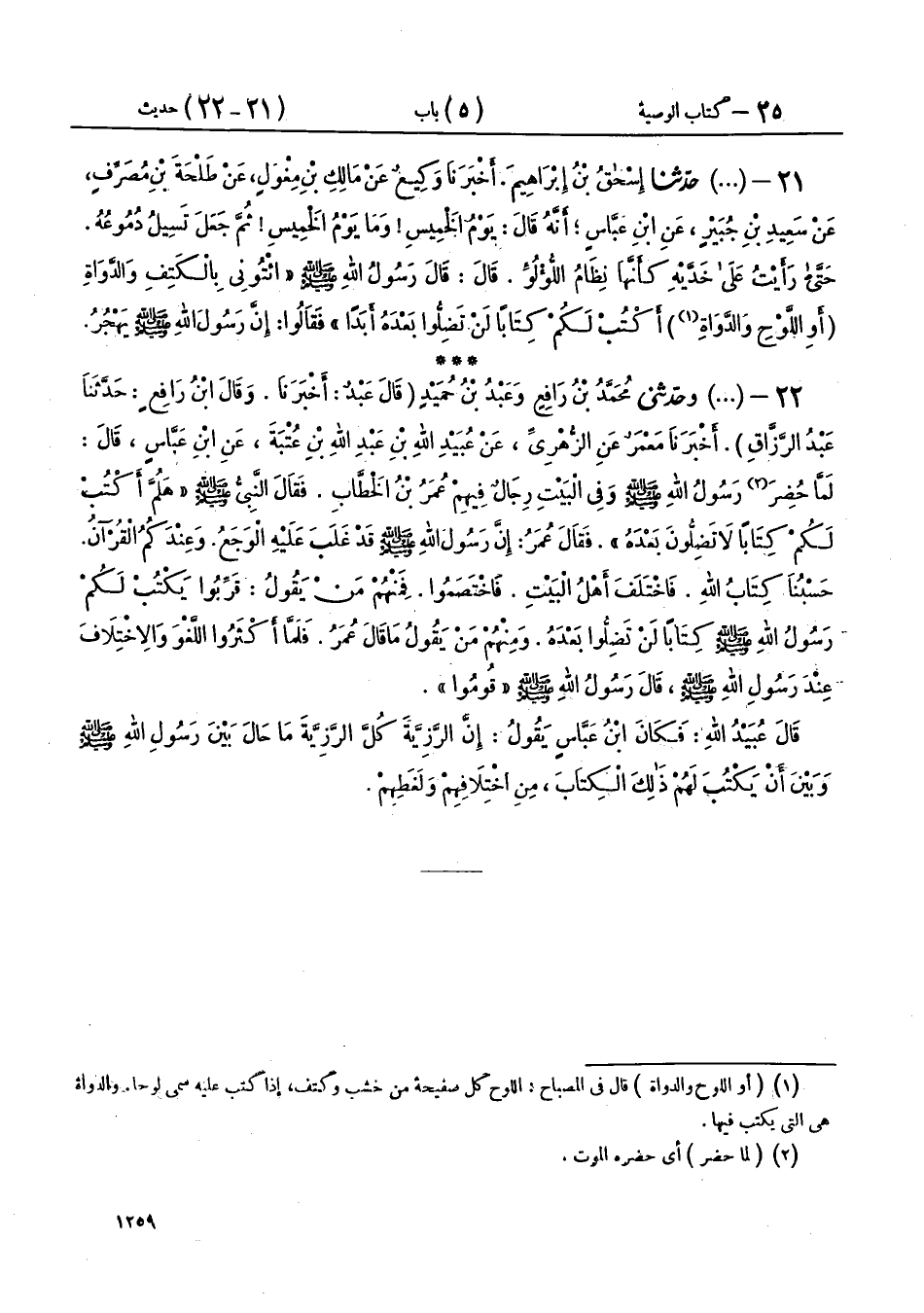 22 - (1637) وحَدَّثَنِي مُحَمَّدُ بْنُ رَافِعٍ، وَعَبْدُ بْنُ حُمَيْدٍ، قَالَ عَبْدٌ: أَخْبَرَنَا، وقَالَ ابْنُ رَافِعٍ: حَدَّثَنَا عَبْدُ الرَّزَّاقِ، أَخْبَرَنَا مَعْمَرٌ، عَنِ الزُّهْرِيِّ، عَنْ عُبَيْدِ اللهِ بْنِ عَبْدِ اللهِ بْنِ عُتْبَةَ، عَنِ ابْنِ عَبَّاسٍ، قَالَ: لَمَّا حُضِرَ رَسُولُ اللهِ صَلَّى اللهُ عَلَيْهِ وَسَلَّمَ وَفِي الْبَيْتِ رِجَالٌ فِيهِمْ عُمَرُ بْنُ الْخَطَّابِ، فَقَالَ النَّبِيُّ صَلَّى اللهُ عَلَيْهِ وَسَلَّمَ: «§هَلُمَّ أَكْتُبْ لَكُمْ كِتَابًا لَا تَضِلُّونَ بَعْدَهُ»، فَقَالَ عُمَرُ: إِنَّ رَسُولَ اللهِ صَلَّى اللهُ عَلَيْهِ وَسَلَّمَ قَدْ غَلَبَ عَلَيْهِ الْوَجَعُ، وَعِنْدَكُمُ الْقُرْآنُ حَسْبُنَا كِتَابُ اللهِ، فَاخْتَلَفَ أَهْلُ الْبَيْتِ، فَاخْتَصَمُوا فَمِنْهُمْ مَنْ يَقُولُ: قَرِّبُوا يَكْتُبْ لَكُمْ رَسُولُ اللهِ صَلَّى اللهُ عَلَيْهِ وَسَلَّمَ كِتَابًا لَنْ تَضِلُّوا بَعْدَهُ، وَمِنْهُمْ مَنْ يَقُولُ مَا قَالَ عُمَرُ، فَلَمَّا أَكْثَرُوا اللَّغْوَ وَالِاخْتِلَافَ عِنْدَ رَسُولِ اللهِ صَلَّى اللهُ عَلَيْهِ وَسَلَّمَ، قَالَ رَسُولُ اللهِ صَلَّى اللهُ عَلَيْهِ وَسَلَّمَ: «قُومُوا»، قَالَ عُبَيْدُ اللهِ: فَكَانَ ابْنُ عَبَّاسٍ، يَقُولُ: «إِنَّ الرَّزِيَّةَ كُلَّ الرَّزِيَّةِ مَا حَالَ بَيْنَ رَسُولِ اللهِ صَلَّى اللهُ عَلَيْهِ وَسَلَّمَ وَبَيْنَ أَنْ يَكْتُبَ لَهُمْ ذَلِكَ الْكِتَابَ مِنِ اخْتِلَافِهِمْ وَلَغَطِهِمْ»