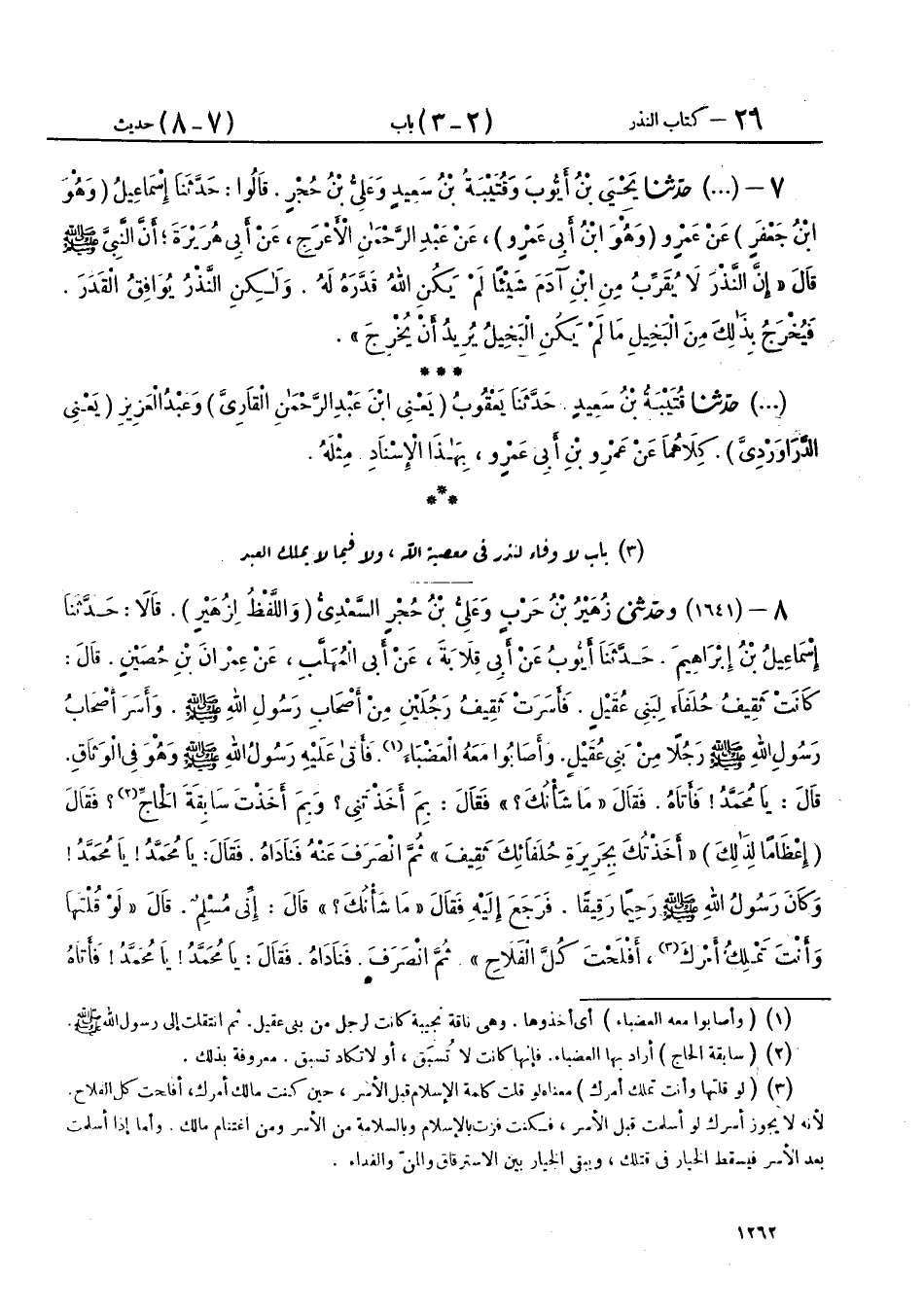 8 - (1641) وحَدَّثَنِي زُهَيْرُ بْنُ حَرْبٍ، وَعَلِيُّ بْنُ حُجْرٍ السَّعْدِيُّ، وَاللَّفْظُ لِزُهَيْرٍ، قَالَا: حَدَّثَنَا إِسْمَاعِيلُ بْنُ إِبْرَاهِيمَ، حَدَّثَنَا أَيُّوبُ، عَنْ أَبِي قِلَابَةَ، عَنْ أَبِي الْمُهَلَّبِ، عَنْ عِمْرَانَ بْنِ حُصَيْنٍ، قَالَ: كَانَتْ ثَقِيفُ حُلَفَاءَ لِبَنِى عُقَيْلٍ، فَأَسَرَتْ ثَقِيفُ رَجُلَيْنِ مِنْ أَصْحَابِ رَسُولِ اللهِ صَلَّى اللهُ عَلَيْهِ وَسَلَّمَ، وَأَسَرَ أَصْحَابُ رَسُولِ اللهِ صَلَّى اللهُ عَلَيْهِ وَسَلَّمَ، رَجُلًا مِنْ بَنِي عُقَيْلٍ، وَأَصَابُوا مَعَهُ الْعَضْبَاءَ، فَأَتَى عَلَيْهِ رَسُولُ اللهِ صَلَّى اللهُ عَلَيْهِ وَسَلَّمَ وَهُوَ فِي الْوَثَاقِ، قَالَ: يَا مُحَمَّدُ، فَأَتَاهُ، فَقَالَ: «مَا شَأْنُكَ؟» فَقَالَ: بِمَ أَخَذْتَنِي، وَبِمَ أَخَذْتَ سَابِقَةَ الْحَاجِّ؟ فَقَالَ: «إِعْظَامًا لِذَلِكَ أَخَذْتُكَ بِجَرِيرَةِ حُلَفَائِكَ ثَقِيفَ»، ثُمَّ انْصَرَفَ عَنْهُ، فَنَادَاهُ، فَقَالَ: يَا مُحَمَّدُ، يَا مُحَمَّدُ، وَكَانَ رَسُولُ اللهِ صَلَّى اللهُ عَلَيْهِ وَسَلَّمَ رَحِيمًا رَقِيقًا، فَرَجَعَ إِلَيْهِ، فَقَالَ: «مَا شَأْنُكَ؟» قَالَ: إِنِّي مُسْلِمٌ، قَالَ: «لَوْ قُلْتَهَا وَأَنْتَ تَمْلِكُ أَمْرَكَ أَفْلَحْتَ كُلَّ الْفَلَاحِ»، ثُمَّ انْصَرَفَ، فَنَادَاهُ، فَقَالَ: يَا مُحَمَّدُ، يَا مُحَمَّدُ، فَأَتَاهُ، فَقَالَ: «مَا شَأْنُكَ؟» قَالَ: إِنِّي جَائِعٌ فَأَطْعِمْنِي، وَظَمْآنُ فَأَسْقِنِي، قَالَ: «هَذِهِ حَاجَتُكَ»، فَفُدِيَ بِالرَّجُلَيْنِ، قَالَ: وَأُسِرَتِ امْرَأَةٌ مِنَ الْأَنْصَارِ وَأُصِيبَتِ الْعَضْبَاءُ، فَكَانَتِ الْمَرْأَةُ فِي الْوَثَاقِ وَكَانَ الْقَوْمُ يُرِيحُونَ نَعَمَهُمْ بَيْنَ يَدَيْ بُيُوتِهِمْ، فَانْفَلَتَتْ ذَاتَ لَيْلَةٍ مِنَ الْوَثَاقِ، فَأَتَتِ الْإِبِلَ، فَجَعَلَتْ إِذَا دَنَتْ مِنَ الْبَعِيرِ رَغَا فَتَتْرُكُهُ حَتَّى تَنْتَهِيَ إِلَى الْعَضْبَاءِ، فَلَمْ تَرْغُ، قَالَ: وَنَاقَةٌ مُنَوَّقَةٌ فَقَعَدَتْ فِي عَجُزِهَا، ثُمَّ زَجَرَتْهَا فَانْطَلَقَتْ، وَنَذِرُوا بِهَا فَطَلَبُوهَا فَأَعْجَزَتْهُمْ، قَالَ: وَنَذَرَتْ لِلَّهِ إِنْ نَجَّاهَا اللهُ عَلَيْهَا لَتَنْحَرَنَّهَا، فَلَمَّا قَدِمَتِ الْمَدِينَةَ رَآهَا النَّاسُ، فَقَالُوا: الْعَضْبَاءُ نَاقَةُ رَسُولِ اللهِ صَلَّى اللهُ عَلَيْهِ وَسَلَّمَ، فَقَالَتْ: إِنَّهَا نَذَرَتْ إِنْ نَجَّاهَا اللهُ عَلَيْهَا لَتَنْحَرَنَّهَا، فَأَتَوْا رَسُولَ اللهِ صَلَّى اللهُ عَلَيْهِ وَسَلَّمَ، فَذَكَرُوا ذَلِكَ لَهُ، فَقَالَ: «سُبْحَانَ اللهِ، بِئْسَمَا جَزَتْهَا، نَذَرَتْ لِلَّهِ إِنْ نَجَّاهَا اللهُ عَلَيْهَا لَتَنْحَرَنَّهَا، §لَا وَفَاءَ لِنَذْرٍ فِي مَعْصِيَةٍ، وَلَا فِيمَا لَا يَمْلِكُ الْعَبْدُ»، وَفِي رِوَايَةِ ابْنِ حُجْرٍ: «لَا نَذْرَ فِي مَعْصِيَةِ اللهِ»،