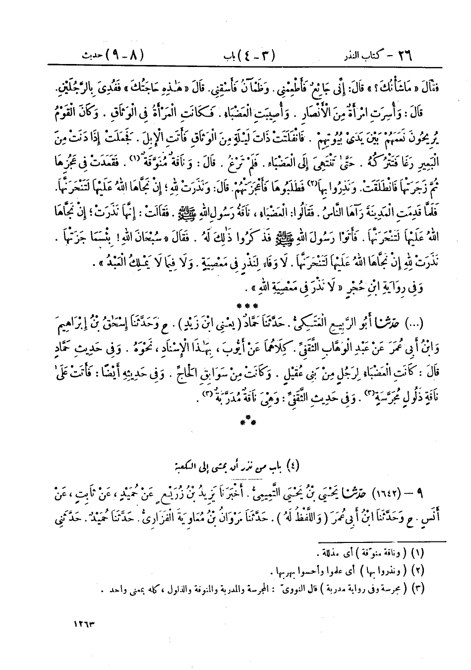 9 - (1642) حَدَّثَنَا يَحْيَى بْنُ يَحْيَى التَّمِيمِيُّ، أَخْبَرَنَا يَزِيدُ بْنُ زُرَيْعٍ، عَنْ حُمَيْدٍ، عَنْ ثَابِتٍ، عَنْ أَنَسٍ، ح وحَدَّثَنَا ابْنُ أَبِي عُمَرَ، وَاللَّفْظُ لَهُ، حَدَّثَنَا مَرْوَانُ بْنُ مُعَاوِيَةَ الْفَزَارِيُّ، حَدَّثَنَا حُمَيْدٌ، حَدَّثَنِي ثَابِتٌ، عَنْ أَنَسٍ، أَنَّ النَّبِيَّ صَلَّى اللهُ عَلَيْهِ وَسَلَّمَ رَأَى شَيْخًا يُهَادَى بَيْنَ ابْنَيْهِ، فَقَالَ: «مَا بَالُ هَذَا؟» قَالُوا: نَذَرَ أَنْ يَمْشِيَ، قَالَ: «إِنَّ §اللهَ عَنْ تَعْذِيبِ هَذَا نَفْسَهُ لَغَنِيٌّ»، وَأَمَرَهُ أَنْ يَرْكَبَ