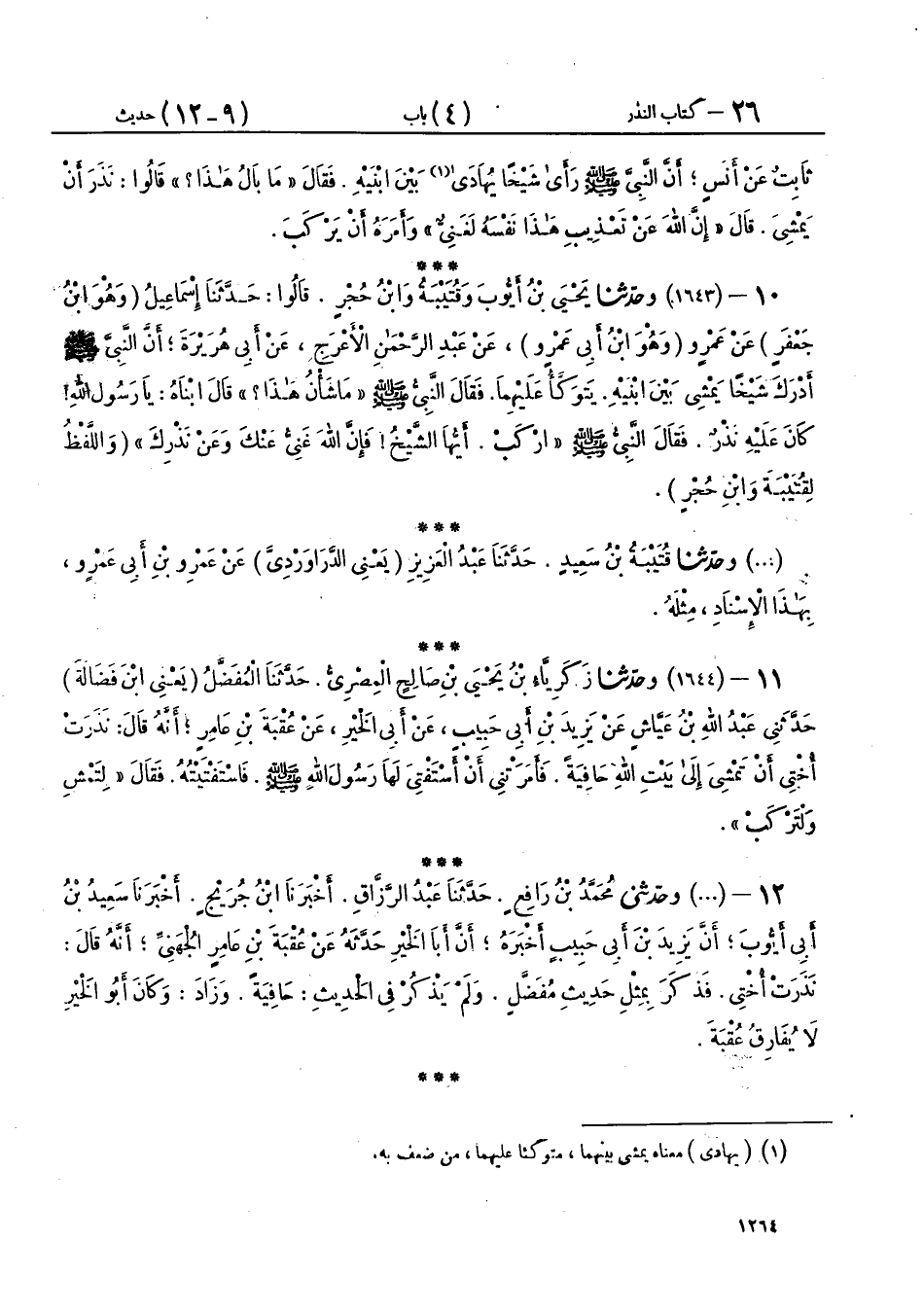 10 - (1643) وحَدَّثَنَا يَحْيَى بْنُ أَيُّوبَ، وَقُتَيْبَةُ، وَابْنُ حُجْرٍ، قَالُوا: حَدَّثَنَا إِسْمَاعِيلُ وَهُوَ ابْنُ جَعْفَرٍ، عَنْ عَمْرٍو وَهُوَ ابْنُ أَبِي عَمْرٍو، عَنْ عَبْدِ الرَّحْمَنِ الْأَعْرَجِ، عَنْ أَبِي هُرَيْرَةَ، أَنَّ النَّبِيَّ صَلَّى اللهُ عَلَيْهِ وَسَلَّمَ أَدْرَكَ شَيْخًا يَمْشِي بَيْنَ ابْنَيْهِ، يَتَوَكَّأُ عَلَيْهِمَا، فَقَالَ النَّبِيُّ صَلَّى اللهُ عَلَيْهِ وَسَلَّمَ: «مَا شَأْنُ هَذَا؟» قَالَ ابْنَاهُ: يَا رَسُولَ اللهِ، كَانَ عَلَيْهِ نَذْرٌ، فَقَالَ النَّبِيُّ صَلَّى اللهُ عَلَيْهِ وَسَلَّمَ: «ارْكَبْ أَيُّهَا الشَّيْخُ، فَإِنَّ §اللهَ غَنِيٌّ عَنْكَ، وَعَنْ نَذْرِكَ»، وَاللَّفْظُ لِقُتَيْبَةَ، وَابْنِ حُجْرٍ،