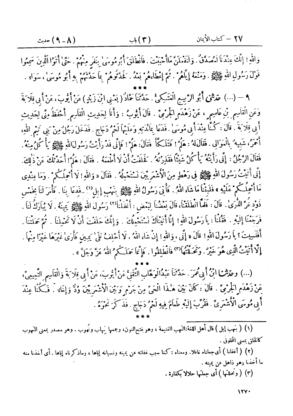 9 - (1649) حَدَّثَنِي أَبُو الرَّبِيعِ الْعَتَكِيُّ، حَدَّثَنَا حَمَّادٌ يَعْنِي ابْنَ زَيْدٍ، عَنْ أَيُّوبَ، عَنْ أَبِي قِلَابَةَ، وَعَنِ الْقَاسِمِ بْنِ عَاصِمٍ، عَنْ زَهْدَمٍ الْجَرْمِيِّ، قَالَ أَيُّوبُ: وَأَنَا لِحَدِيثِ الْقَاسِمِ، أَحْفَظُ مِنِّي لِحَدِيثِ أَبِي قِلَابَةَ، قَالَ: كُنَّا عِنْدَ أَبِي مُوسَى فَدَعَا بِمَائِدَتِهِ وَعَلَيْهَا لَحْمُ دَجَاجٍ، فَدَخَلَ رَجُلٌ مِنْ بَنِي تَيْمِ اللهِ، أَحْمَرُ شَبِيهٌ بِالْمَوَالِي، فَقَالَ لَهُ: هَلُمَّ، فَتَلَكَّأَ، فَقَالَ: هَلُمَّ، فَإِنِّي قَدْ رَأَيْتُ رَسُولَ اللهِ صَلَّى اللهُ عَلَيْهِ وَسَلَّمَ يَأْكُلُ مِنْهُ، فَقَالَ الرَّجُلُ: إِنِّي رَأَيْتُهُ يَأْكُلُ شَيْئًا، فَقَذِرْتُهُ، فَحَلَفْتُ أَنْ لَا أَطْعَمَهُ، فَقَالَ: هَلُمَّ أُحَدِّثْكَ عَنْ ذَلِكَ، إِنِّي أَتَيْتُ رَسُولَ اللهِ صَلَّى اللهُ عَلَيْهِ وَسَلَّمَ فِي رَهْطٍ مِنَ الْأَشْعَرِيِّينَ نَسْتَحْمِلُهُ، فَقَالَ: «وَاللهِ لَا أَحْمِلُكُمْ وَمَا عِنْدِي مَا أَحْمِلُكُمْ عَلَيْهِ»، فَلَبِثْنَا مَا شَاءَ اللهُ، فَأُتِيَ رَسُولُ اللهِ صَلَّى اللهُ عَلَيْهِ وَسَلَّمَ بِنَهْبِ إِبِلٍ، فَدَعَا بِنَا، فَأَمَرَ لَنَا بِخَمْسِ ذَوْدٍ غُرِّ الذُّرَى، قَالَ: فَلَمَّا انْطَلَقْنَا، قَالَ بَعْضُنَا لِبَعْضٍ: أَغْفَلْنَا رَسُولَ اللهِ صَلَّى اللهُ عَلَيْهِ وَسَلَّمَ يَمِينَهُ، لَا يُبَارَكُ لَنَا، فَرَجَعْنَا إِلَيْهِ، فَقُلْنَا: يَا رَسُولَ اللهِ، إِنَّا أَتَيْنَاكَ نَسْتَحْمِلُكَ، وَإِنَّكَ حَلَفْتَ أَنْ لَا تَحْمِلَنَا، ثُمَّ حَمَلْتَنَا أَفَنَسِيتَ يَا رَسُولَ اللهِ؟ قَالَ: «إِنِّي وَاللهِ إِنْ شَاءَ اللهُ، §لَا أَحْلِفُ عَلَى يَمِينٍ، فَأَرَى غَيْرَهَا خَيْرًا مِنْهَا، إِلَّا أَتَيْتُ الَّذِي هُوَ خَيْرٌ وَتَحَلَّلْتُهَا، فَانْطَلِقُوا فَإِنَّمَا حَمَلَكُمُ اللهُ عَزَّ وَجَلَّ»،