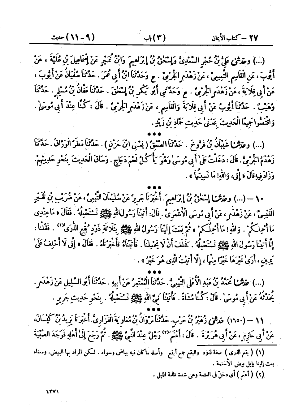 10 - (1649) وحَدَّثَنَا إِسْحَاقُ بْنُ إِبْرَاهِيمَ، أَخْبَرَنَا جَرِيرٌ، عَنْ سُلَيْمَانَ التَّيْمِيِّ، عَنْ ضُرَيْبِ بْنِ نُقَيْرٍ الْقَيْسِيِّ، عَنْ زَهْدَمٍ، عَنْ أَبِي مُوسَى الْأَشْعَرِيِّ، قَالَ: أَتَيْنَا رَسُولَ اللهِ صَلَّى اللهُ عَلَيْهِ وَسَلَّمَ نَسْتَحْمِلُهُ، فَقَالَ: «مَا عِنْدِي مَا أَحْمِلُكُمْ، وَاللهِ مَا أَحْمِلُكُمْ»، ثُمَّ بَعَثَ إِلَيْنَا رَسُولُ اللهِ صَلَّى اللهُ عَلَيْهِ وَسَلَّمَ بِثَلَاثَةِ ذَوْدٍ بُقْعِ الذُّرَى، فَقُلْنَا: إِنَّا أَتَيْنَا رَسُولَ اللهِ صَلَّى اللهُ عَلَيْهِ وَسَلَّمَ نَسْتَحْمِلُهُ، فَحَلَفَ أَنْ لَا يَحْمِلَنَا، فَأَتَيْنَاهُ فَأَخْبَرْنَاهُ، فَقَالَ: «§إِنِّي لَا أَحْلِفُ عَلَى يَمِينٍ، أَرَى غَيْرَهَا خَيْرًا مِنْهَا، إِلَّا أَتَيْتُ الَّذِي هُوَ خَيْرٌ»،