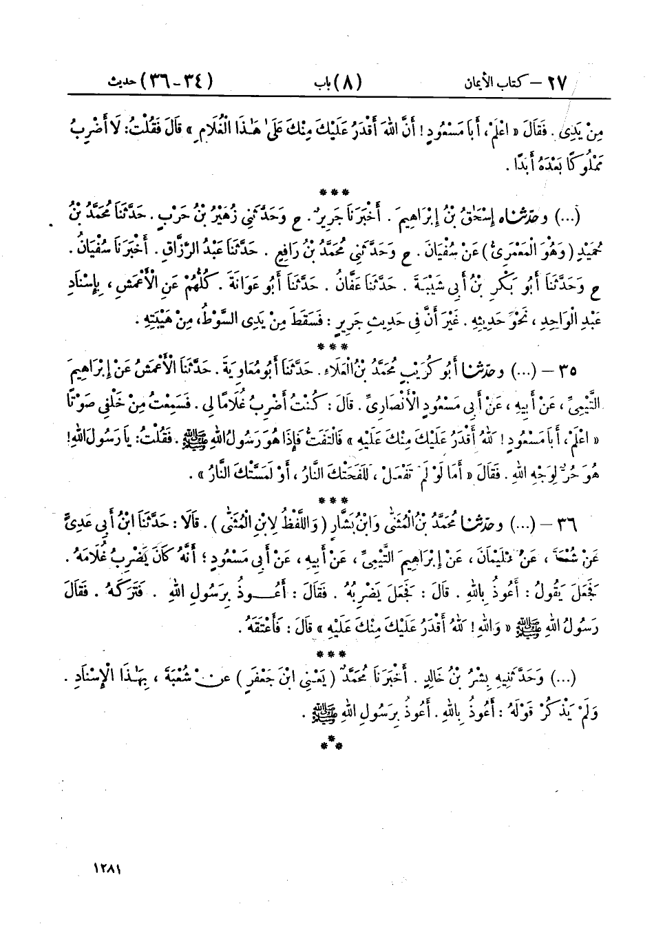 36 - (1659) وَحَدَّثَنَا مُحَمَّدُ بْنُ الْمُثَنَّى، وَابْنُ بَشَّارٍ وَاللَّفْظُ لِابْنِ الْمُثَنَّى، قَالَا: حَدَّثَنَا ابْنُ أَبِي عَدِيٍّ، عَنْ شُعْبَةَ، عَنْ سُلَيْمَانَ، عَنْ إِبْرَاهِيمَ التَّيْمِيِّ، عَنْ أَبِيهِ، عَنْ أَبِي مَسْعُودٍ، أَنَّهُ كَانَ يَضْرِبُ غُلَامَهُ، فَجَعَلَ يَقُولُ: أَعُوذُ بِاللهِ، قَالَ: فَجَعَلَ يَضْرِبُهُ، فَقَالَ: أَعُوذُ بِرَسُولِ اللهِ، فَتَرَكَهُ، فَقَالَ رَسُولُ اللهِ صَلَّى اللهُ عَلَيْهِ وَسَلَّمَ: «وَاللهِ §لَلَّهُ أَقْدَرُ عَلَيْكَ مِنْكَ عَلَيْهِ»، قَالَ: فَأَعْتَقَهُ،