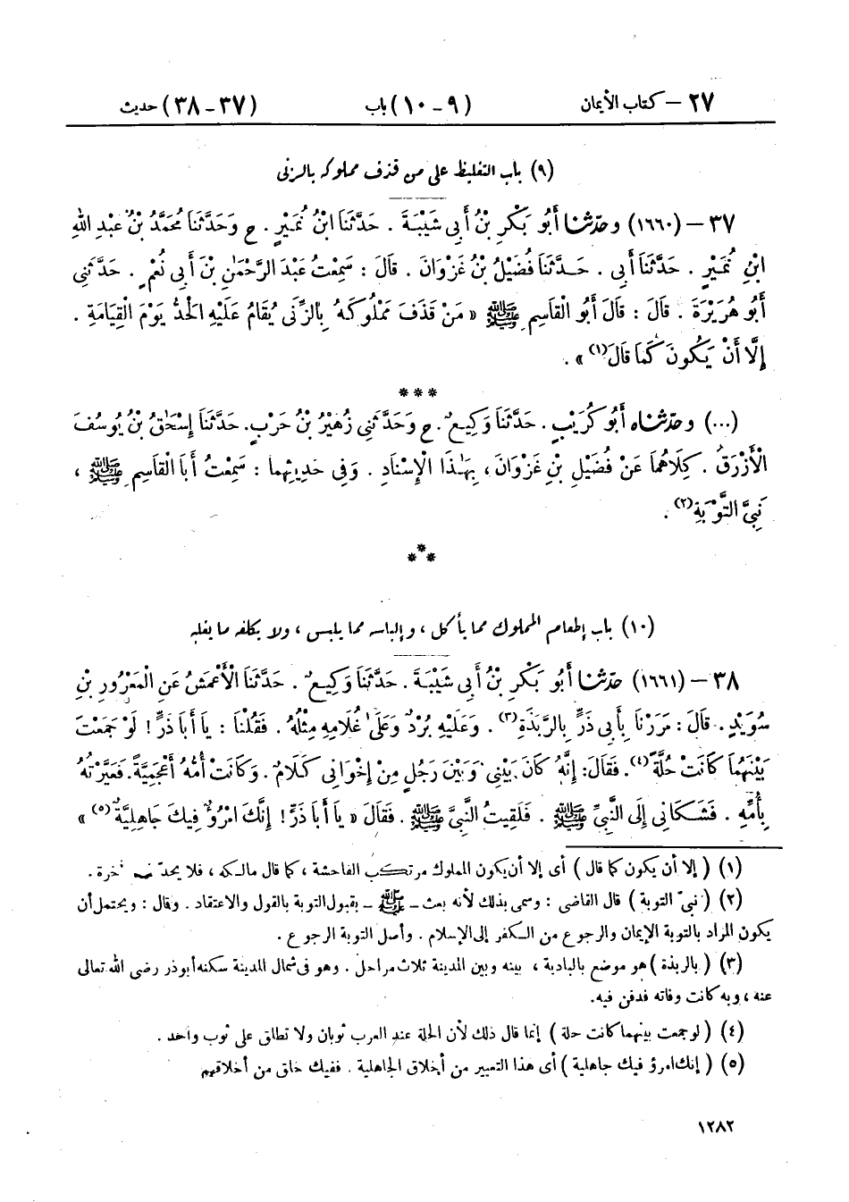 37 - (1660) وحَدَّثَنَا أَبُو بَكْرِ بْنُ أَبِي شَيْبَةَ، حَدَّثَنَا ابْنُ نُمَيْرٍ، ح وحَدَّثَنَا مُحَمَّدُ بْنُ عَبْدِ اللهِ بْنِ نُمَيْرٍ، حَدَّثَنَا أَبِي، حَدَّثَنَا فُضَيْلُ بْنُ غَزْوَانَ، قَالَ: سَمِعْتُ عَبْدَ الرَّحْمَنِ بْنَ أَبِي نُعْمٍ، حَدَّثَنِي أَبُو هُرَيْرَةَ، قَالَ: قَالَ أَبُو الْقَاسِمِ صَلَّى اللهُ عَلَيْهِ وَسَلَّمَ: «§مَنْ قَذَفَ مَمْلُوكَهُ بِالزِّنَا، يُقَامُ عَلَيْهِ الْحَدُّ يَوْمَ الْقِيَامَةِ، إِلَّا أَنْ يَكُونَ كَمَا قَالَ»،