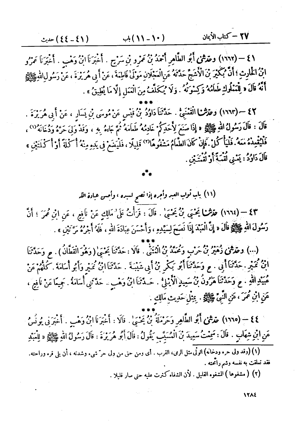43 - (1664) حَدَّثَنَا يَحْيَى بْنُ يَحْيَى، قَالَ: قَرَأْتُ عَلَى مَالِكٍ، عَنْ نَافِعٍ، عَنِ ابْنِ عُمَرَ، أَنَّ رَسُولَ اللهِ صَلَّى اللهُ عَلَيْهِ وَسَلَّمَ قَالَ: «إِنَّ §الْعَبْدَ إِذَا نَصَحَ لِسَيِّدِهِ، وَأَحْسَنَ عِبَادَةَ اللهِ، فَلَهُ أَجْرُهُ مَرَّتَيْنِ»،