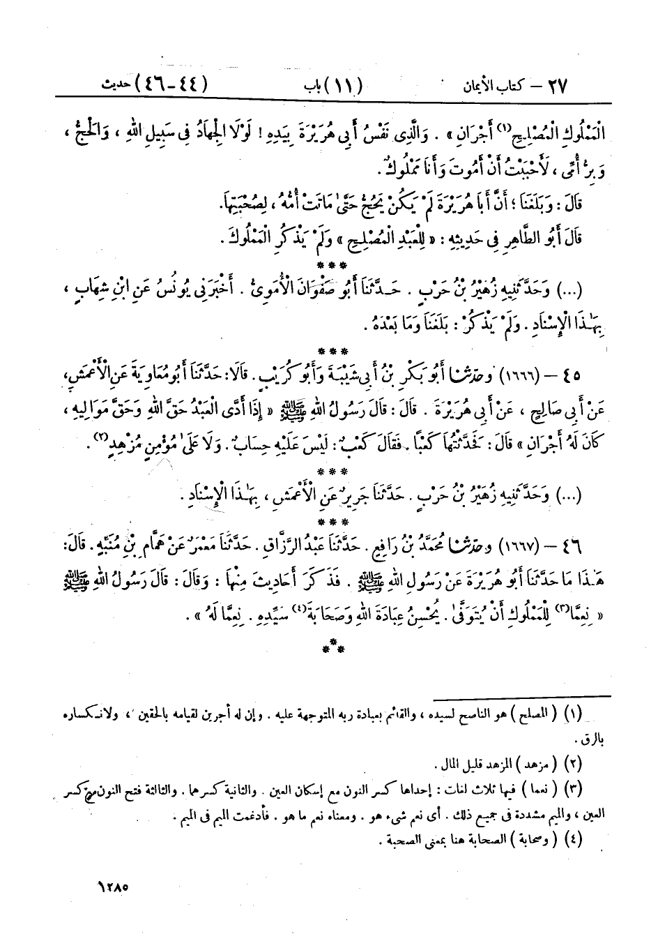45 - (1666) وحَدَّثَنَا أَبُو بَكْرِ بْنُ أَبِي شَيْبَةَ، وَأَبُو كُرَيْبٍ، قَالَا: حَدَّثَنَا أَبُو مُعَاوِيَةَ، عَنِ الْأَعْمَشِ، عَنْ أَبِي صَالِحٍ، عَنْ أَبِي هُرَيْرَةَ، قَالَ: قَالَ رَسُولُ اللهِ صَلَّى اللهُ عَلَيْهِ وَسَلَّمَ: «§إِذَا أَدَّى الْعَبْدُ حَقَّ اللهِ وَحَقَّ مَوَالِيهِ، كَانَ لَهُ أَجْرَانِ»، قَالَ: فَحَدَّثْتُهَا كَعْبًا، فَقَالَ كَعْبٌ: «لَيْسَ عَلَيْهِ حِسَابٌ وَلَا عَلَى مُؤْمِنٍ مُزْهِدٍ»،