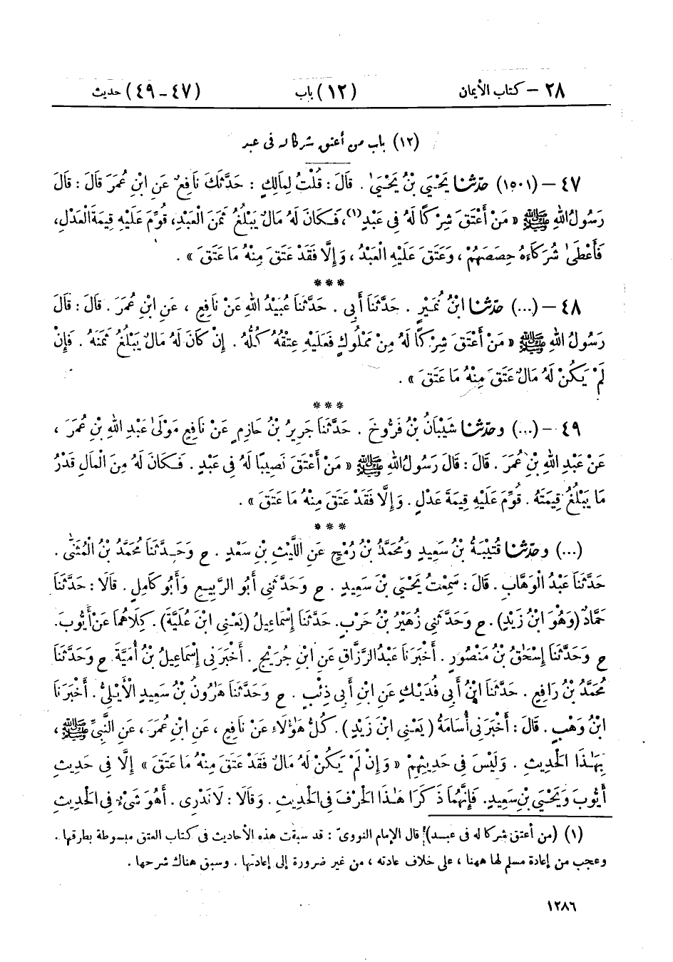 47 - (1501) حَدَّثَنَا يَحْيَى بْنُ يَحْيَى، قَالَ: قُلْتُ لِمَالِكٍ: حَدَّثَكَ نَافِعٌ، عَنِ ابْنِ عُمَرَ، قَالَ: قَالَ رَسُولُ اللهِ صَلَّى اللهُ عَلَيْهِ وَسَلَّمَ: «§مَنْ أَعْتَقَ شِرْكًا لَهُ فِي عَبْدٍ، فَكَانَ لَهُ مَالٌ يَبْلُغُ ثَمَنَ الْعَبْدِ، قُوِّمَ عَلَيْهِ قِيمَةَ الْعَدْلِ، فَأَعْطَى شُرَكَاءَهُ حِصَصَهُمْ، وَعَتَقَ عَلَيْهِ الْعَبْدُ، وَإِلَّا فَقَدْ عَتَقَ مِنْهُ مَا عَتَقَ»