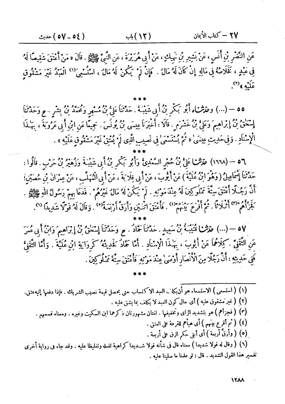 55 - (1503) وَحَدَّثَنَاهُ أَبُو بَكْرِ بْنُ أَبِي شَيْبَةَ، حَدَّثَنَا عَلِيُّ بْنُ مُسْهِرٍ، وَمُحَمَّدُ بْنُ بِشْرٍ، ح وحَدَّثَنَا إِسْحَاقُ بْنُ إِبْرَاهِيمَ، وَعَلِيُّ بْنُ خَشْرَمٍ، قَالَا: أَخْبَرَنَا عِيسَى بْنُ يُونُسَ، جَمِيعًا عَنِ ابْنِ أَبِي عَرُوبَةَ، بِهَذَا الْإِسْنَادِ، وَفِي حَدِيثِ عِيسَى: «ثُمَّ يُسْتَسْعَى فِي نَصِيبِ الَّذِي لَمْ يُعْتِقْ غَيْرَ مَشْقُوقٍ عَلَيْهِ»