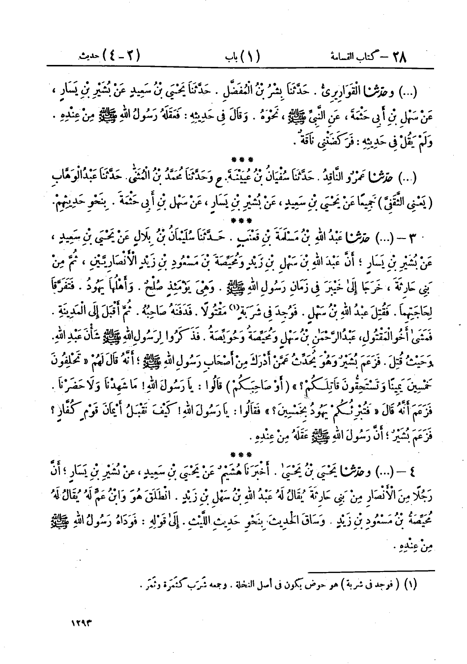 4 - (1669) وحَدَّثَنَا يَحْيَى بْنُ يَحْيَى، أَخْبَرَنَا هُشَيْمٌ، عَنْ يَحْيَى بْنِ سَعِيدٍ، عَنْ بُشَيْرِ بْنِ يَسَارٍ، أَنَّ رَجُلًا مِنَ الْأَنْصَارِ مِنْ بَنِي حَارِثَةَ يُقَالُ لَهُ: عَبْدُ اللهِ بْنُ سَهْلِ بْنِ زَيْدٍ انْطَلَقَ هُوَ وَابْنُ عَمٍّ لَهُ يُقَالُ لَهُ: مُحَيِّصَةُ بْنُ مَسْعُودِ بْنِ زَيْدٍ وَسَاقَ الْحَدِيثَ بِنَحْوِ حَدِيثِ اللَّيْثِ إِلَى قَوْلِهِ فَوَدَاهُ رَسُولُ اللهِ صَلَّى اللهُ عَلَيْهِ وَسَلَّمَ مِنْ عِنْدِهِ، قَالَ يَحْيَى، فَحَدَّثَنِي بُشَيْرُ بْنُ يَسَارٍ، قَالَ: أَخْبَرَنِي سَهْلُ بْنُ أَبِي حَثْمَةَ، قَالَ: لَقَدْ رَكَضَتْنِي فَرِيضَةٌ مِنْ تِلْكَ الْفَرَائِضِ بِالْمِرْبَدِ،