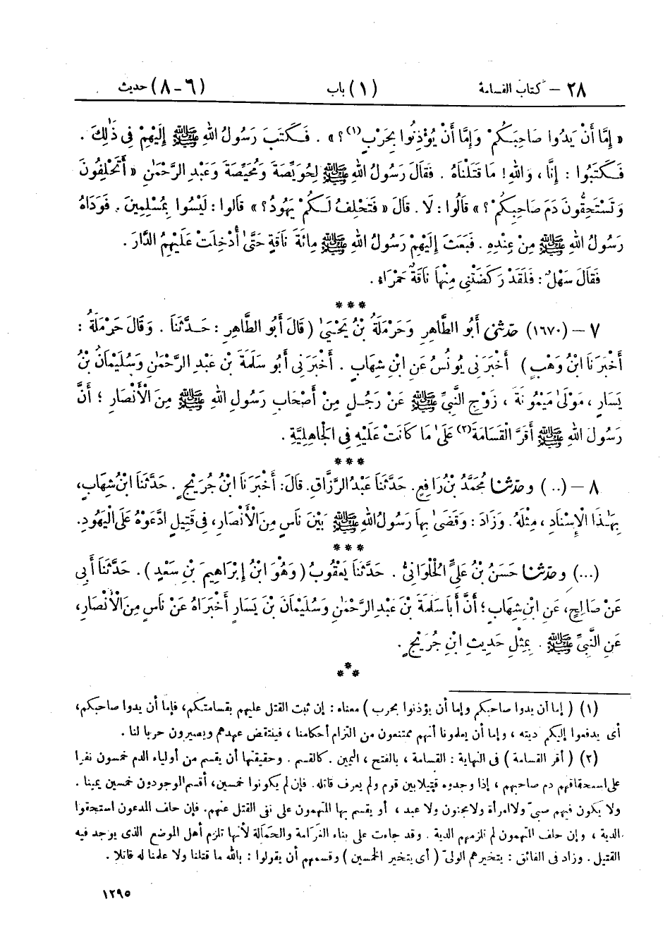 7 - (1670) حَدَّثَنِي أَبُو الطَّاهِرِ، وَحَرْمَلَةُ بْنُ يَحْيَى، قَالَ أَبُو الطَّاهِرِ: حَدَّثَنَا، وقَالَ حَرْمَلَةُ: أَخْبَرَنَا ابْنُ وَهْبٍ، أَخْبَرَنِي يُونُسُ، عَنِ ابْنِ شِهَابٍ، أَخْبَرَنِي أَبُو سَلَمَةَ بْنُ عَبْدِ الرَّحْمَنِ، وَسُلَيْمَانُ بْنُ يَسَارٍ، مَوْلَى مَيْمُونَةَ، زَوْجِ النَّبِيِّ صَلَّى اللهُ عَلَيْهِ وَسَلَّمَ، عَنْ رَجُلٍ مِنْ أَصْحَابِ رَسُولِ اللهِ صَلَّى اللهُ عَلَيْهِ وَسَلَّمَ مِنَ الْأَنْصَارِ، «أَنَّ رَسُولَ اللهِ صَلَّى اللهُ عَلَيْهِ وَسَلَّمَ §أَقَرَّ الْقَسَامَةَ عَلَى مَا كَانَتْ عَلَيْهِ فِي الْجَاهِلِيَّةِ»،
