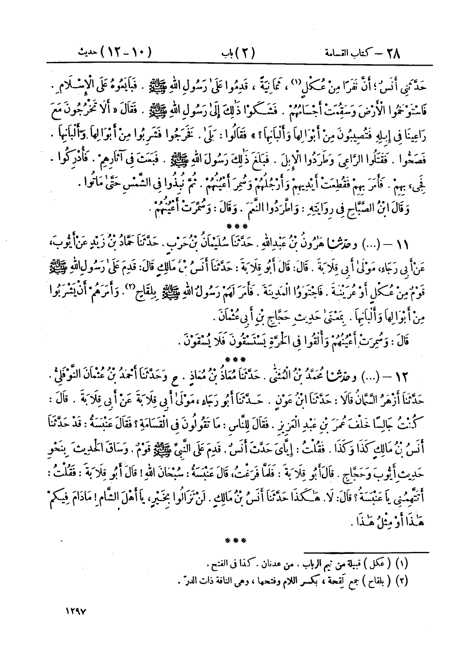 12 - (1671) وحَدَّثَنَا مُحَمَّدُ بْنُ الْمُثَنَّى، حَدَّثَنَا مُعَاذُ بْنُ مُعَاذٍ، ح وحَدَّثَنَا أَحْمَدُ بْنُ عُثْمَانَ النَّوْفَلِيُّ، حَدَّثَنَا أَزْهَرُ السَّمَّانُ، قَالَا: حَدَّثَنَا ابْنُ عَوْنٍ، حَدَّثَنَا أَبُو رَجَاءٍ، مَوْلَى أَبِي قِلَابَةَ، عَنْ أَبِي قِلَابَةَ، قَالَ: كُنْتُ جَالِسًا خَلْفَ عُمَرَ بْنِ عَبْدِ الْعَزِيزِ، فَقَالَ لِلنَّاسِ: مَا تَقُولُونَ فِي الْقَسَامَةِ؟ فَقَالَ عَنْبَسَةُ: قَدْ حَدَّثَنَا أَنَسُ بْنُ مَالِكٍ كَذَا وَكَذَا، فَقُلْتُ إِيَّايَ: حَدَّثَ أَنَسٌ، قَدِمَ عَلَى النَّبِيِّ صَلَّى اللهُ عَلَيْهِ وَسَلَّمَ قَوْمٌ، وَسَاقَ الْحَدِيثَ بِنَحْوِ حَدِيثِ أَيُّوبَ، وَحَجَّاجٍ، قَالَ أَبُو قِلَابَةَ: فَلَمَّا فَرَغْتُ قَالَ عَنْبَسَةُ: سُبْحَانَ اللهِ، قَالَ أَبُو قِلَابَةَ: فَقُلْتُ: أَتَتَّهِمُنِي يَا عَنْبَسَةُ؟ قَالَ: لَا، هَكَذَا حَدَّثَنَا أَنَسُ بْنُ مَالِكٍ، لَنْ تَزَالُوا بِخَيْرٍ يَا أَهْلَ الشَّامِ، مَا دَامَ فِيكُمْ هَذَا أَوْ مِثْلُ هَذَا،