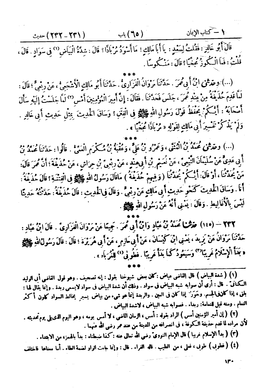 (144) وَحَدَّثَنِي ابْنُ أَبِي عُمَرَ، حَدَّثَنَا مَرْوَانُ الْفَزَارِيُّ، حَدَّثَنَا أَبُو مَالِكٍ الْأَشْجَعِيُّ، عَنْ رِبْعِيٍّ، قالَ: لَمَّا قَدِمَ حُذَيْفَةُ مِنْ عِنْدِ عُمَرَ جَلَسَ، فَحَدَّثَنَا، فَقَالَ: إِنَّ أَمِيرَ الْمُؤْمِنِينَ أَمْسِ لَمَّا جَلَسْتُ إِلَيْهِ سَأَلَ أَصْحَابَهُ، أَيُّكُمْ يَحْفَظُ قَوْلَ رَسُولِ اللهِ صَلَّى اللهُ عَلَيْهِ وَسَلَّمَ فِي الْفِتَنِ؟ وَسَاقَ الْحَدِيثَ بِمِثْلِ حَدِيثِ أَبِي خَالِدٍ، وَلَمْ يَذْكُرْ تَفْسِيرَ أَبِي مَالِكٍ لِقَوْلِهِ: «مُرْبَادًّا مُجَخِّيًا»،