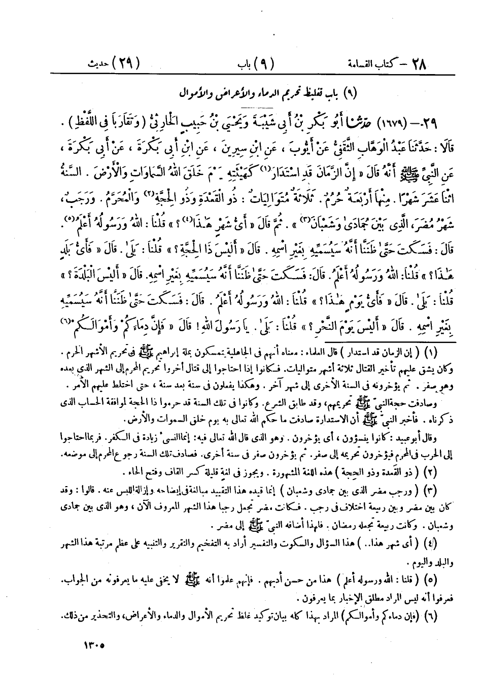 29 - (1679) حَدَّثَنَا أَبُو بَكْرِ بْنُ أَبِي شَيْبَةَ، وَيَحْيَى بْنُ حَبِيبٍ الْحَارِثِيُّ، وَتَقَارَبَا فِي اللَّفْظِ، قَالَا: حَدَّثَنَا عَبْدُ الْوَهَّابِ الثَّقَفِيُّ، عَنْ أَيُّوبَ، عَنِ ابْنِ سِيرِينَ، عَنِ ابْنِ أَبِي بَكْرَةَ، عَنْ أَبِي بَكْرَةَ، عَنِ النَّبِيِّ صَلَّى اللهُ عَلَيْهِ وَسَلَّمَ أَنَّهُ قَالَ: " إِنَّ الزَّمَانَ قَدِ اسْتَدَارَ كَهَيْئَتِهِ يَوْمَ خَلَقَ اللهُ السَّمَوَاتِ وَالْأَرْضَ، السَّنَةُ اثْنَا عَشَرَ شَهْرًا، مِنْهَا أَرْبَعَةٌ حُرُمٌ، ثَلَاثَةٌ مُتَوَالِيَاتٌ: ذُو الْقَعْدَةِ، وَذُو الْحِجَّةِ، وَالْمُحَرَّمُ، وَرَجَبٌ شَهْرُ مُضَرَ الَّذِي بَيْنَ جُمَادَى وَشَعْبَانَ "، ثُمَّ قَالَ: «أَيُّ شَهْرٍ هَذَا؟» قُلْنَا: اللهُ وَرَسُولُهُ أَعْلَمُ، قَالَ: فَسَكَتَ حَتَّى ظَنَنَّا أَنَّهُ سَيُسَمِّيهِ بِغَيْرِ اسْمِهِ، قَالَ: «أَلَيْسَ ذَا الْحِجَّةِ؟» قُلْنَا: بَلَى، قَالَ: «فَأَيُّ بَلَدٍ هَذَا؟» قُلْنَا: اللهُ وَرَسُولُهُ أَعْلَمُ، قَالَ: فَسَكَتَ حَتَّى ظَنَنَّا أَنَّهُ سَيُسَمِّيهِ بِغَيْرِ اسْمِهِ، قَالَ: «أَلَيْسَ الْبَلْدَةَ؟»، قُلْنَا: بَلَى، قَالَ: «فَأَيُّ يَوْمٍ هَذَا؟» قُلْنَا: اللهُ وَرَسُولُهُ أَعْلَمُ، قَالَ: فَسَكَتَ حَتَّى ظَنَنَّا أَنَّهُ سَيُسَمِّيهِ بِغَيْرِ اسْمِهِ، قَالَ: «أَلَيْسَ يَوْمَ النَّحْرِ؟» قُلْنَا: بَلَى يَا رَسُولَ اللهِ، قَالَ: " فَإِنَّ §دِمَاءَكُمْ وَأَمْوَالَكُمْ - قَالَ مُحَمَّدٌ: وَأَحْسِبُهُ قَالَ: وَأَعْرَاضَكُمْ - حَرَامٌ عَلَيْكُمْ، كَحُرْمَةِ يَوْمِكُمْ هَذَا، فِي بَلَدِكُمْ هَذَا، فِي شَهْرِكُمْ هَذَا، وَسَتَلْقَوْنَ رَبَّكُمْ فَيَسْأَلُكُمْ عَنْ أَعْمَالِكُمْ، فَلَا تَرْجِعُنَّ بَعْدِي كُفَّارًا - أَوْ ضُلَّالًا - يَضْرِبُ بَعْضُكُمْ رِقَابَ بَعْضٍ، أَلَا لِيُبَلِّغِ الشَّاهِدُ الْغَائِبَ، فَلَعَلَّ بَعْضَ مَنْ يُبَلِّغُهُ يَكُونُ أَوْعَى لَهُ مِنْ بَعْضِ مَنْ سَمِعَهُ "، ثُمَّ قَالَ: «أَلَا هَلْ بَلَّغْتُ؟» قَالَ ابْنُ حَبِيبٍ فِي رِوَايَتِهِ: وَرَجَبُ مُضَرَ، وَفِي رِوَايَةِ أَبِي بَكْرٍ: «فَلَا تَرْجِعُوا بَعْدِي»