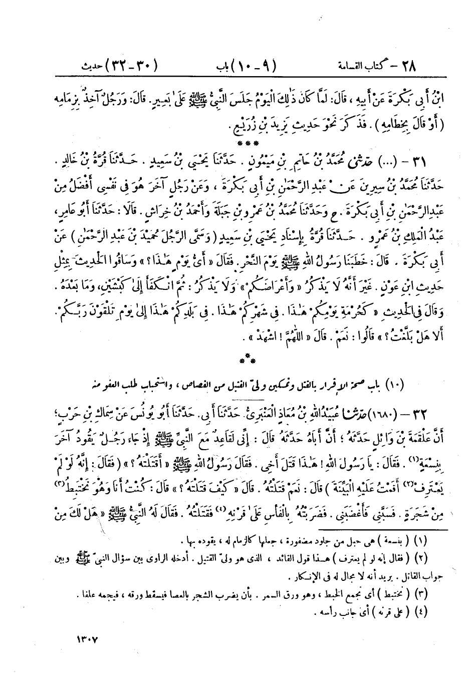 32 - (1680) حَدَّثَنَا عُبَيْدُ اللهِ بْنُ مُعَاذٍ الْعَنْبَرِيُّ، حَدَّثَنَا أَبِي، حَدَّثَنَا أَبُو يُونُسَ، عَنْ سِمَاكِ بْنِ حَرْبٍ، أَنَّ عَلْقَمَةَ بْنَ وَائِلٍ، حَدَّثَهُ أَنَّ أَبَاهُ، حَدَّثَهُ، قَالَ: إِنِّي لَقَاعِدٌ مَعَ النَّبِيِّ صَلَّى اللهُ عَلَيْهِ وَسَلَّمَ إِذْ جَاءَ رَجُلٌ يَقُودُ آخَرَ بِنِسْعَةٍ، فَقَالَ: يَا رَسُولَ اللهِ، هَذَا قَتَلَ أَخِي، فَقَالَ رَسُولُ اللهِ صَلَّى اللهُ عَلَيْهِ وَسَلَّمَ: «§أَقَتَلْتَهُ؟» - فَقَالَ: إِنَّهُ لَوْ لَمْ يَعْتَرِفْ أَقَمْتُ عَلَيْهِ الْبَيِّنَةَ - قَالَ: نَعَمْ قَتَلْتَهُ، قَالَ: «كَيْفَ قَتَلْتَهُ؟» قَالَ: كُنْتُ أَنَا وَهُوَ نَخْتَبِطُ مِنْ شَجَرَةٍ، فَسَبَّنِي، فَأَغْضَبَنِي، فَضَرَبْتُهُ بِالْفَأْسِ عَلَى قَرْنِهِ، فَقَتَلْتُهُ، فَقَالَ لَهُ النَّبِيُّ صَلَّى اللهُ عَلَيْهِ وَسَلَّمَ: «هَلْ لَكَ مِنْ شَيْءٍ تُؤَدِّيهِ عَنْ نَفْسِكَ؟» قَالَ: مَا لِي مَالٌ إِلَّا كِسَائِي وَفَأْسِي، قَالَ: «فَتَرَى قَوْمَكَ يَشْتَرُونَكَ؟» قَالَ: أَنَا أَهْوَنُ عَلَى قَوْمِي مِنْ ذَاكَ، فَرَمَى إِلَيْهِ بِنِسْعَتِهِ، وَقَالَ: «دُونَكَ صَاحِبَكَ»، فَانْطَلَقَ بِهِ الرَّجُلُ، فَلَمَّا وَلَّى قَالَ رَسُولُ اللهِ صَلَّى اللهُ عَلَيْهِ وَسَلَّمَ: «إِنْ قَتَلَهُ فَهُوَ مِثْلُهُ»، فَرَجَعَ، فَقَالَ: يَا رَسُولَ اللهِ، إِنَّهُ بَلَغَنِي أَنَّكَ قُلْتَ: «إِنْ قَتَلَهُ فَهُوَ مِثْلُهُ»، وَأَخَذْتُهُ بِأَمْرِكَ، فَقَالَ رَسُولُ اللهِ صَلَّى اللهُ عَلَيْهِ وَسَلَّمَ: «أَمَا تُرِيدُ أَنْ يَبُوءَ بِإِثْمِكَ، وَإِثْمِ صَاحِبِكَ؟» قَالَ: يَا نَبِيَّ اللهِ - لَعَلَّهُ قَالَ - بَلَى، قَالَ: «فَإِنَّ ذَاكَ كَذَاكَ»، قَالَ: فَرَمَى بِنِسْعَتِهِ وَخَلَّى سَبِيلَهُ