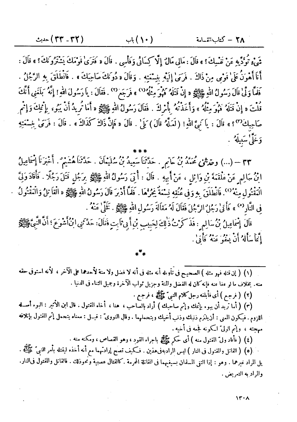 33 - (1680) وحَدَّثَنِي مُحَمَّدُ بْنُ حَاتِمٍ، حَدَّثَنَا سَعِيدُ بْنُ سُلَيْمَانَ، حَدَّثَنَا هُشَيْمٌ، أَخْبَرَنَا إِسْمَاعِيلُ بْنُ سَالِمٍ، عَنْ عَلْقَمَةَ بْنِ وَائِلٍ، عَنْ أَبِيهِ، قَالَ: أُتِيَ رَسُولُ اللهِ صَلَّى اللهُ عَلَيْهِ وَسَلَّمَ بِرَجُلٍ قَتَلَ رَجُلًا، فَأَقَادَ وَلِيَّ الْمَقْتُولِ مِنْهُ، فَانْطَلَقَ بِهِ وَفِي عُنُقِهِ نِسْعَةٌ يَجُرُّهَا، فَلَمَّا أَدْبَرَ، قَالَ رَسُولُ اللهِ صَلَّى اللهُ عَلَيْهِ وَسَلَّمَ: «§الْقَاتِلُ وَالْمَقْتُولُ فِي النَّارِ»، فَأَتَى رَجُلٌ الرَّجُلَ، فَقَالَ لَهُ مَقَالَةَ رَسُولِ اللهِ صَلَّى اللهُ عَلَيْهِ وَسَلَّمَ، فَخَلَّى عَنْهُ قَالَ إِسْمَاعِيلُ بْنُ سَالِمٍ: فَذَكَرْتُ ذَلِكَ لِحَبِيبِ بْنِ أَبِي ثَابِتٍ فَقَالَ: حَدَّثَنِي ابْنُ أَشْوَعَ أَنَّ النَّبِيَّ صَلَّى اللهُ عَلَيْهِ وَسَلَّمَ إِنَّمَا سَأَلَهُ أَنْ يَعْفُوَ عَنْهُ فَأَبَى