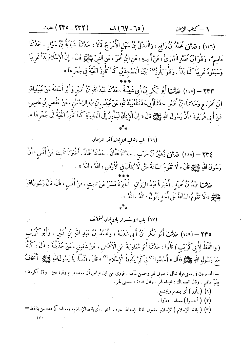 235 - (149) حَدَّثَنَا أَبُو بَكْرِ بْنُ أَبِي شَيْبَةَ، وَمُحَمَّدُ بْنُ عَبْدِ اللهِ بْنِ نُمَيْرٍ، وَأَبُو كُرَيْبٍ، وَاللَّفْظُ لِأَبِي كُرَيْبٍ، قَالُوا: حَدَّثَنَا أَبُو مُعَاوِيَةَ، عَنِ الْأَعْمَشِ، عَنْ شَقِيقٍ، عَنْ حُذَيْفَةَ، قَالَ: كُنَّا مَعَ رَسُولِ اللهِ صَلَّى اللهُ عَلَيْهِ وَسَلَّمَ، فَقَالَ: «أَحْصُوا لِي كَمْ يَلْفِظُ الْإِسْلَامَ»، قَالَ: فَقُلْنَا: يَا رَسُولَ اللهِ، أَتَخَافُ عَلَيْنَا وَنَحْنُ مَا بَيْنَ السِّتِّمِائَةٍ إِلَى السَّبْعِمِائةٍ؟ قَالَ: «§إِنَّكُمْ لَا تَدْرُونَ لَعَلَّكُمْ أَنْ تُبْتَلَوْا»، قَالَ: «فَابْتُلِيَنَا حَتَّى جَعَلَ الرَّجُلُ مِنَّا لَا يُصَلِّي إِلَّا سِرًّا»