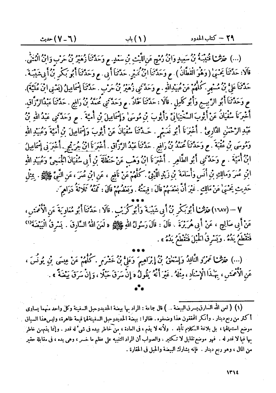 7 - (1687) حَدَّثَنَا أَبُو بَكْرِ بْنُ أَبِي شَيْبَةَ، وَأَبُو كُرَيْبٍ، قَالَا: حَدَّثَنَا أَبُو مُعَاوِيَةَ، عَنِ الْأَعْمَشِ، عَنْ أَبِي صَالِحٍ، عَنْ أَبِي هُرَيْرَةَ، قَالَ: قَالَ رَسُولُ اللهِ صَلَّى اللهُ عَلَيْهِ وَسَلَّمَ: «§لَعَنَ اللهُ السَّارِقَ، يَسْرِقُ الْبَيْضَةَ فَتُقْطَعُ يَدُهُ، وَيَسْرِقُ الْحَبْلَ فَتُقْطَعُ يَدُهُ»،
