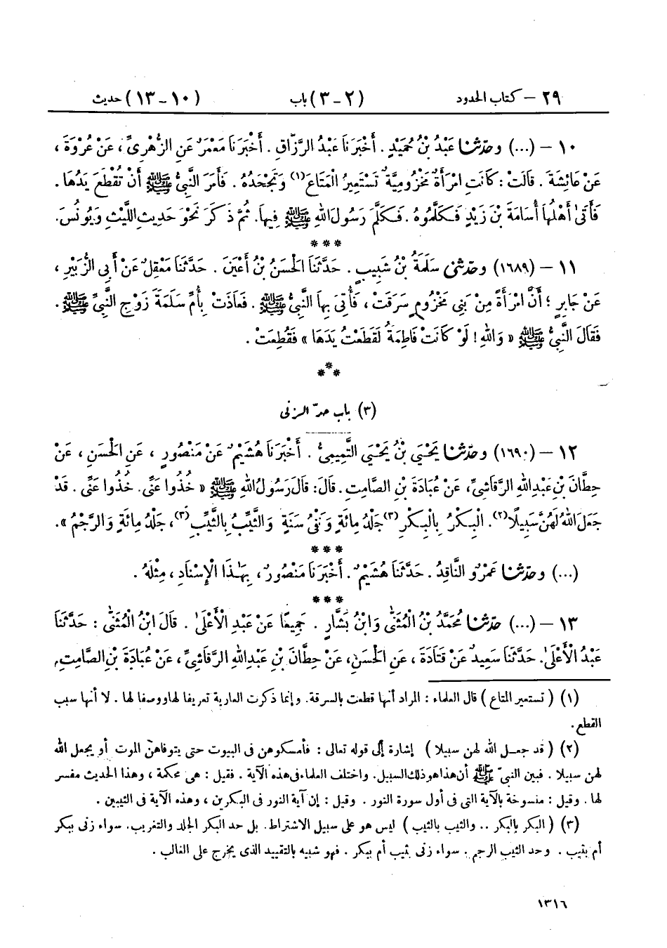 13 - (1690) حَدَّثَنَا مُحَمَّدُ بْنُ الْمُثَنَّى، وَابْنُ بَشَّارٍ، جَمِيعًا، عَنْ عَبْدِ الْأَعْلَى، قَالَ ابْنُ الْمُثَنَّى: حَدَّثَنَا عَبْدُ الْأَعْلَى، حَدَّثَنَا سَعِيدٌ، عَنْ قَتَادَةَ، عَنِ الْحَسَنِ، عَنْ حِطَّانَ بْنِ عَبْدِ اللهِ الرَّقَاشِيِّ، عَنْ عُبَادَةَ بْنِ الصَّامِتِ، قَالَ: كَانَ نَبِيُّ اللهِ صَلَّى اللهُ عَلَيْهِ وَسَلَّمَ إِذَا أُنْزِلَ عَلَيْهِ كُرِبَ لِذَلِكَ، وَتَرَبَّدَ لَهُ وَجْهُهُ قَالَ: فَأُنْزِلَ عَلَيْهِ ذَاتَ يَوْمٍ، فَلُقِيَ كَذَلِكَ، فَلَمَّا سُرِّيَ عَنْهُ، قَالَ: «§خُذُوا عَنِّي، فَقَدْ جَعَلَ اللهُ لَهُنَّ سَبِيلًا، الثَّيِّبُ بِالثَّيِّبِ، وَالْبِكْرُ بِالْبِكْرِ، الثَّيِّبُ جَلْدُ مِائَةٍ، ثُمَّ رَجْمٌ بِالْحِجَارَةِ، وَالْبِكْرُ جَلْدُ مِائَةٍ، ثُمَّ نَفْيُ سَنَةٍ»،