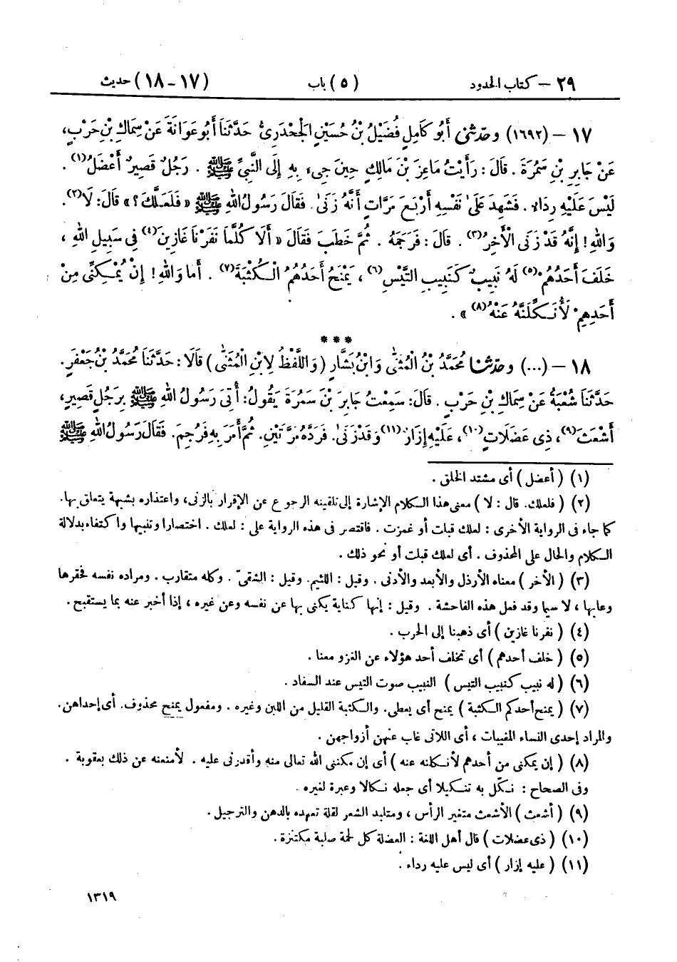 18 - (1692) وحَدَّثَنَا مُحَمَّدُ بْنُ الْمُثَنَّى، وَابْنُ بَشَّارٍ، وَاللَّفْظُ لِابْنِ الْمُثَنَّى، قَالَا: حَدَّثَنَا مُحَمَّدُ بْنُ جَعْفَرٍ، حَدَّثَنَا شُعْبَةُ، عَنْ سِمَاكِ بْنِ حَرْبٍ، قَالَ: سَمِعْتُ جَابِرَ بْنَ سَمُرَةَ، يَقُولُ: أُتِيَ رَسُولُ اللهِ صَلَّى اللهُ عَلَيْهِ وَسَلَّمَ بِرَجُلٍ قَصِيرٍ، أَشْعَثَ، ذِي عَضَلَاتٍ، عَلَيْهِ إِزَارٌ، وَقَدْ زَنَى، فَرَدَّهُ مَرَّتَيْنِ، ثُمَّ أَمَرَ بِهِ فَرُجِمَ، فَقَالَ رَسُولُ اللهِ صَلَّى اللهُ عَلَيْهِ وَسَلَّمَ: «§كُلَّمَا نَفَرْنَا غَازِينَ فِي سَبِيلِ اللهِ، تَخَلَّفَ أَحَدُكُمْ يَنِبُّ نَبِيبَ التَّيْسِ، يَمْنَحُ إِحْدَاهُنَّ الْكُثْبَةَ، إِنَّ اللهَ لَا يُمْكِنِّي مِنْ أَحَدٍ مِنْهُمْ إِلَّا جَعَلْتُهُ نَكَالًا» أَوْ «نَكَّلْتُهُ»، قَالَ: فَحَدَّثْتُهُ سَعِيدَ بْنَ جُبَيْرٍ، فَقَالَ: «إِنَّهُ رَدَّهُ أَرْبَعَ مَرَّاتٍ»،