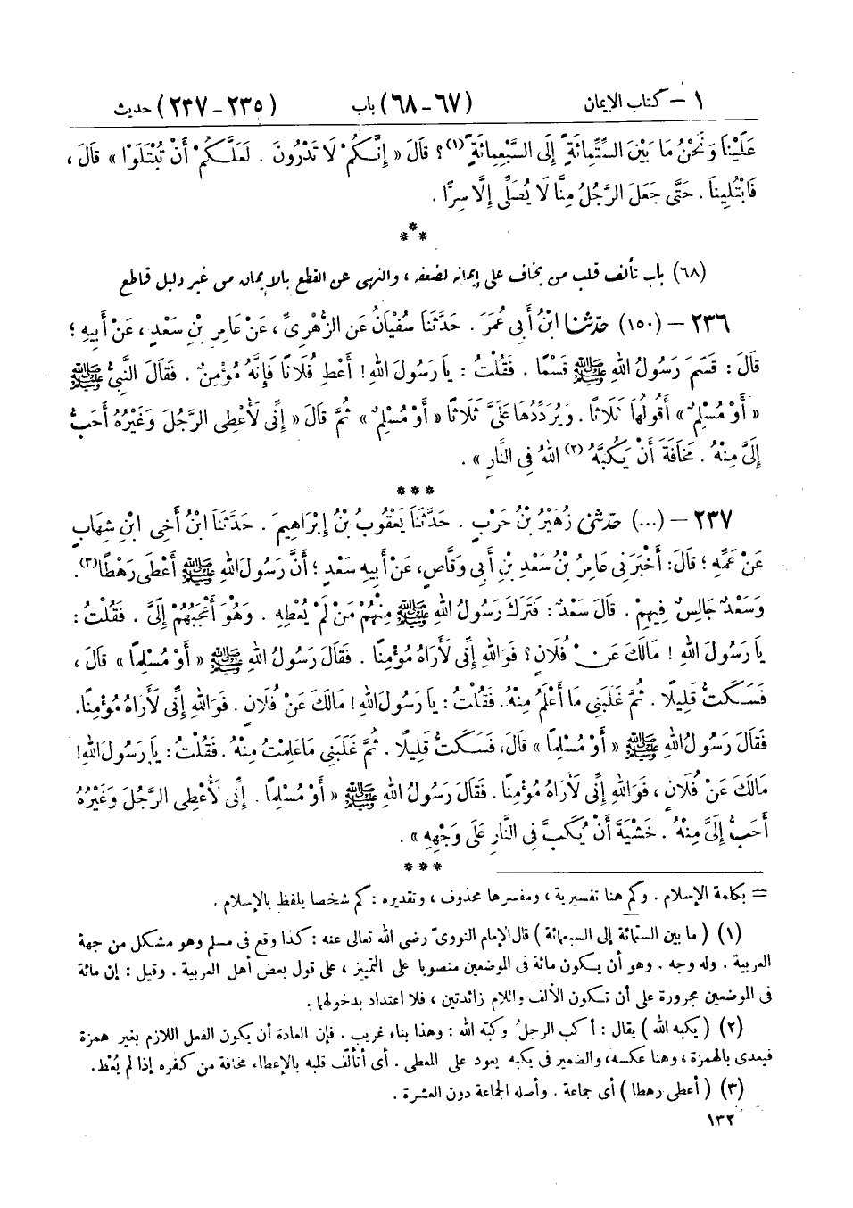 236 - (150) حَدَّثَنَا ابْنُ أَبِي عُمَرَ، حَدَّثَنَا سُفْيَانُ، عَنِ الزُّهْرِيِّ، عَنْ عَامِرِ بْنِ سَعْدٍ، عَنْ أَبِيهِ، قَالَ: قَسَمَ رَسُولُ اللهِ صَلَّى اللهُ عَلَيْهِ وَسَلَّمَ قَسْمًا، فَقُلْتُ: يَا رَسُولَ اللهِ، أَعْطِ فُلَانًا فَإِنَّهُ مُؤْمِنٌ، فَقَالَ النَّبِيُّ صَلَّى اللهُ عَلَيْهِ وَسَلَّمَ: «أَوْ مُسْلِمٌ» أَقُولُهَا ثَلَاثًا، وَيُرَدِّدُهَا عَلَيَّ ثَلَاثًا «أَوْ مُسْلِمٌ»، ثُمَّ قَالَ: «§إِنِّي لَأُعْطِي الرَّجُلَ، وَغَيْرُهُ أَحَبُّ إِلَيَّ مِنْهُ، مَخَافَةَ أَنْ يَكُبَّهُ اللهُ فِي النَّارِ»